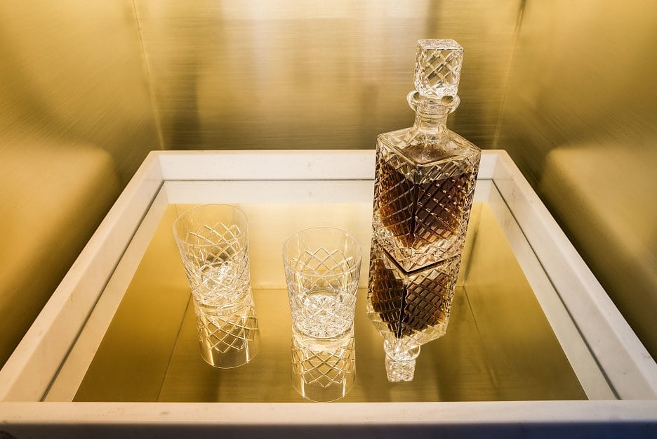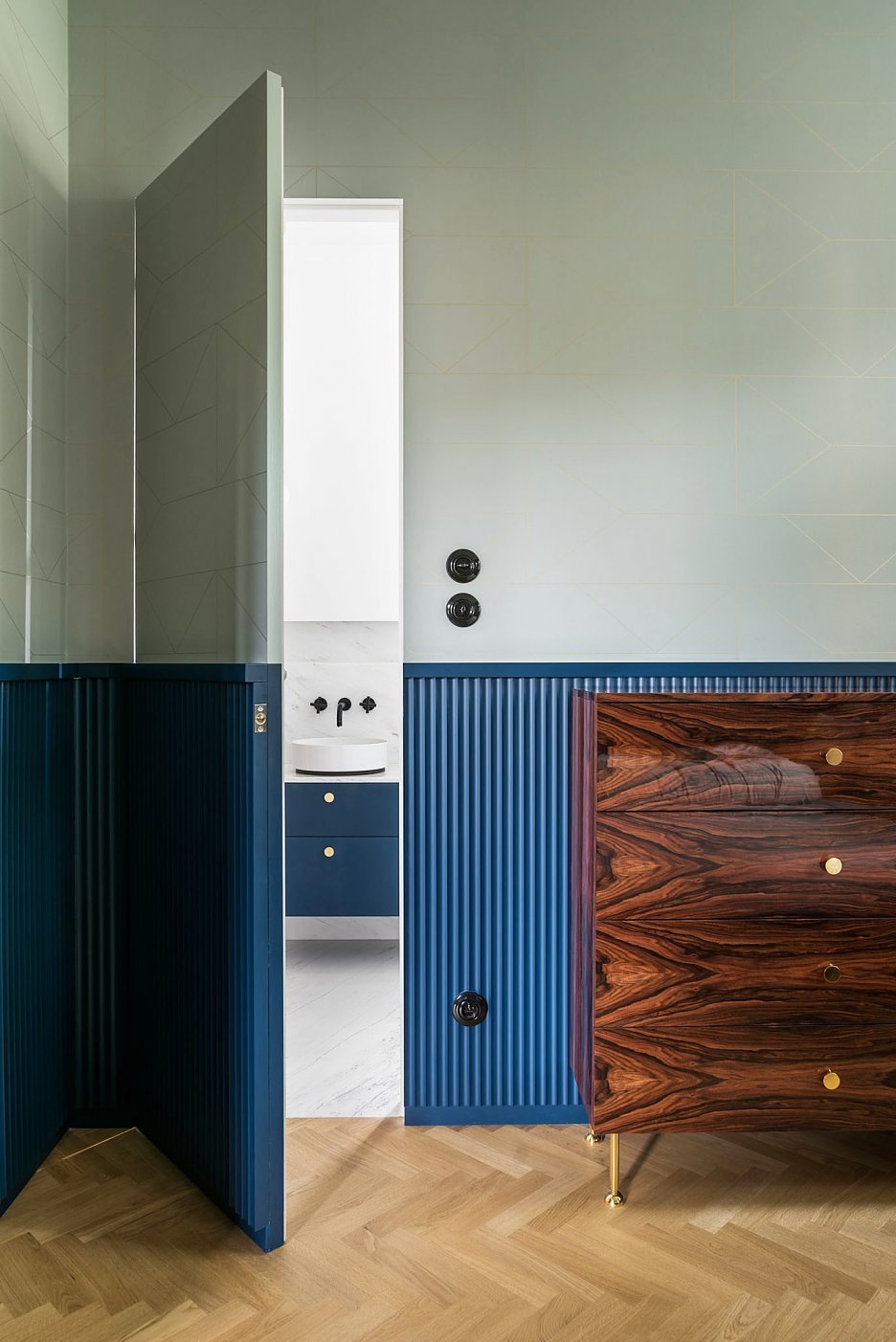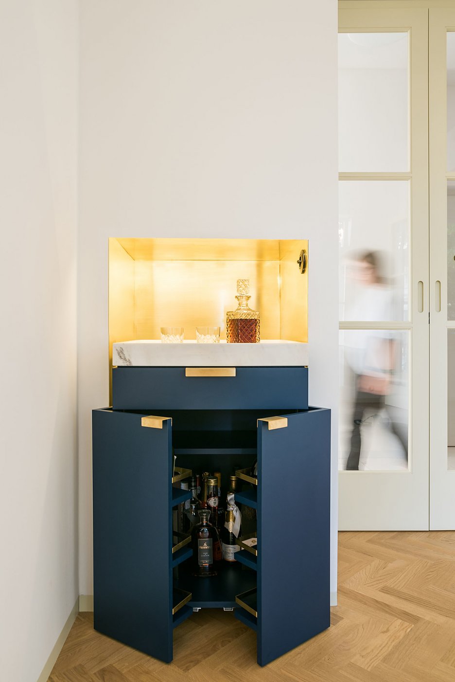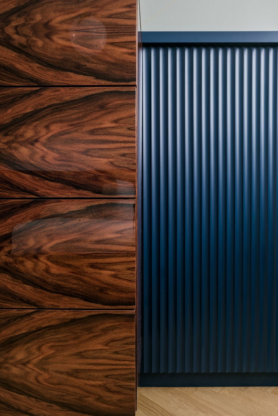 Celkovú atmosféru bytu dopĺňajú drevené dverové a okenné výplne so štíhlym rastrovaním, parkety so stromčekovým vzorom, či nábytok z exotického dreva (leštený palisander). Okrem klasických materiálov (kameň, drevo, mosadz) sa architekti nebáli v interiéri použiť frézovanú MDF dosku striekanú na modro (profilovaný sokel, či dvierka kuchynskej linky), či ružovú farbu v priechodnom šatníku. Dosiahli súčasnú, obľúbenú podobu bytu. Zachovali zároveň stavebnú podstatu diela majstrov. Mobiliár sa časom môže zmeniť. Krásny dom od Weinwurma a Vécseiho však stále bude cítiť v pozadí.