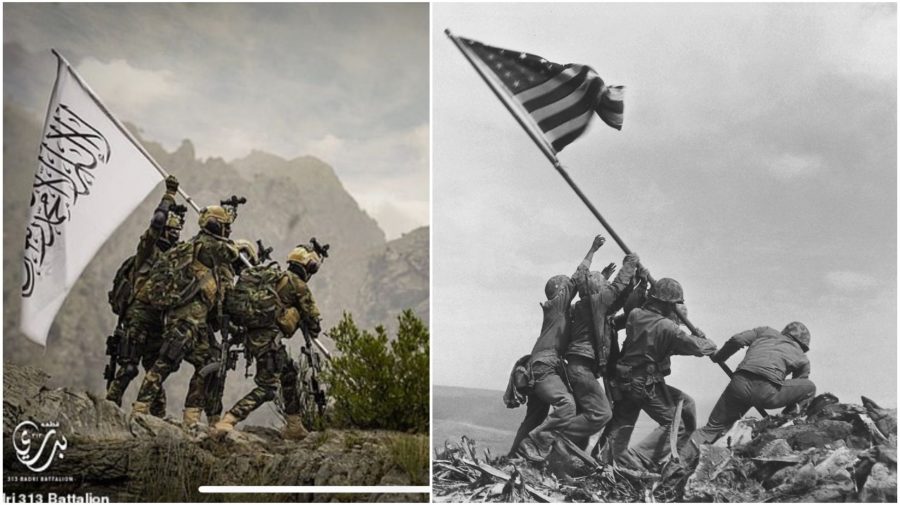 Práve americký taktický výstroj majú na sebe vojaci Talibanu, ktorí sa vysmievajú a napodobňujú ikonickú fotku z druhej svetovej vojny. Príslušníci Talibanu v americkom výstroji vztyčujú vlajku militantného hnutia v Afganistane. Originálna fotka zachytáva amerických vojakov vztyčujúcich americkú vlajku na Iwo Jimu (Japonsko).