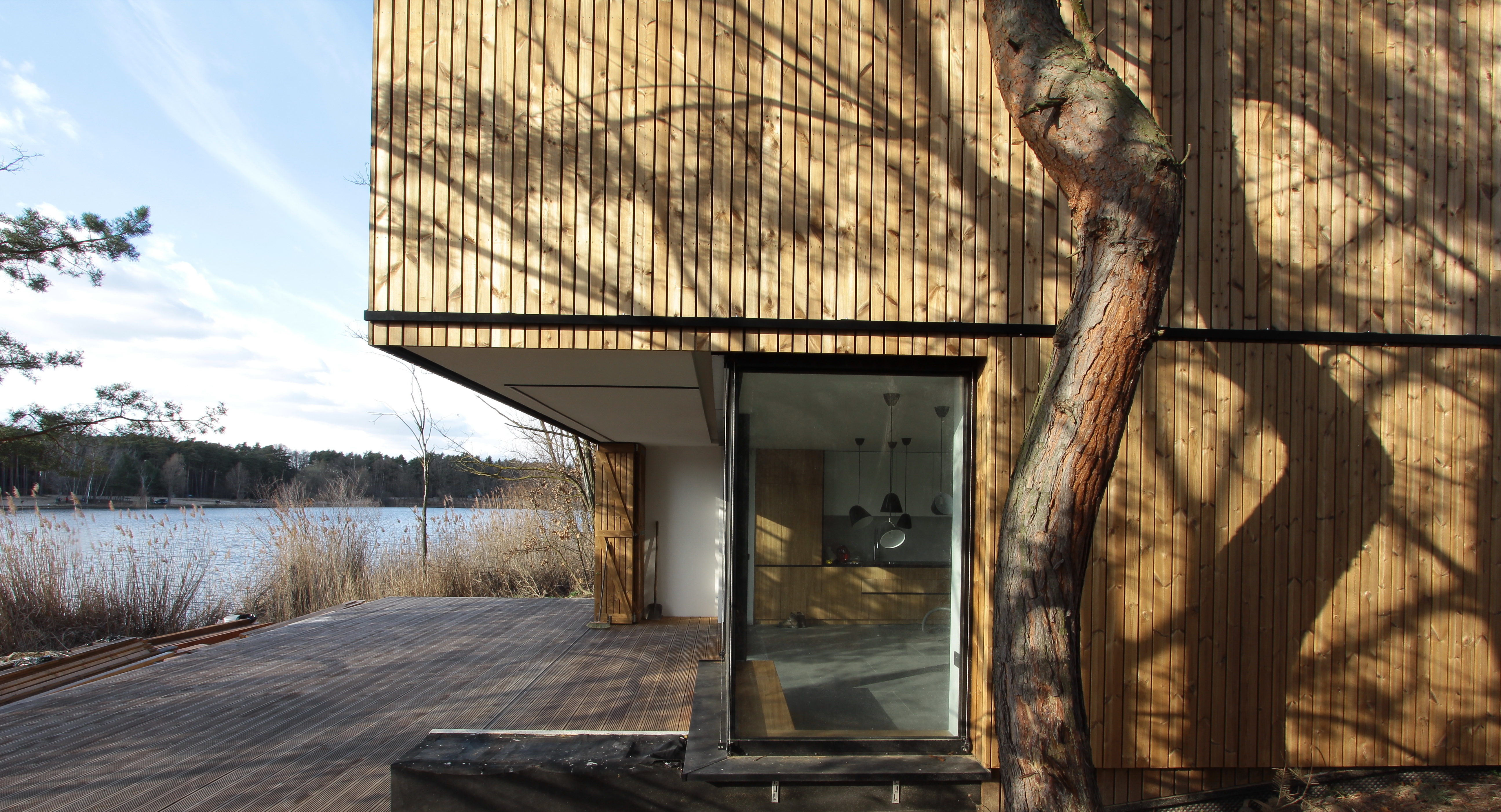 - Objekt s borovicovým obkladom v borovicovom lese na brehu jazera. Kontextuálne riešenie, ktoré ukazuje ako aj moderná stavba môže veľmi dobre komunikovať s okolím.