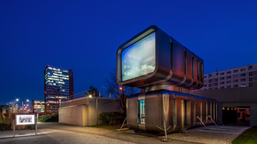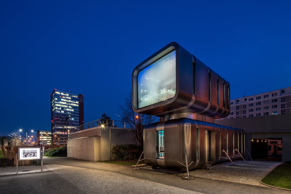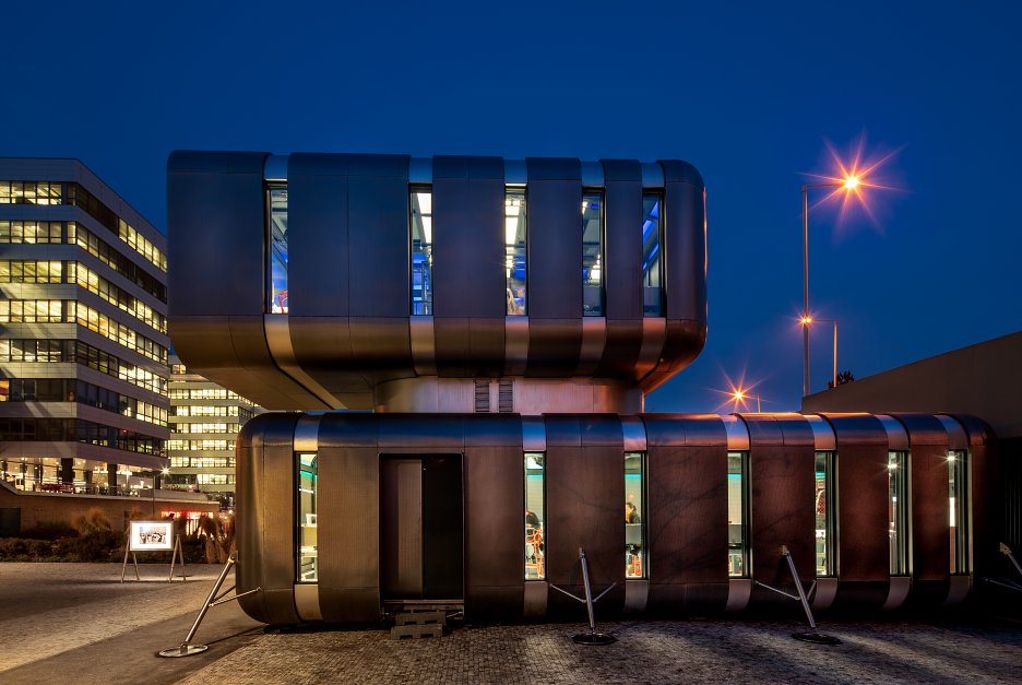 Na nosníky bola následne navarená subtílnejšia podkonštrukcia. Oba moduly boli v celku dopravené na miesto, kde prebiehali dokončovacie práce a inštalácia fasádnych panelov z nehrdzavejúcej ocele. Proces výstavby bol zjednodušený absenciou pevných základov. Stavba je položená na pevnom povrchu, pričom dodatočnú oporu tvoria “nožičky” vybiehajúce do strán.