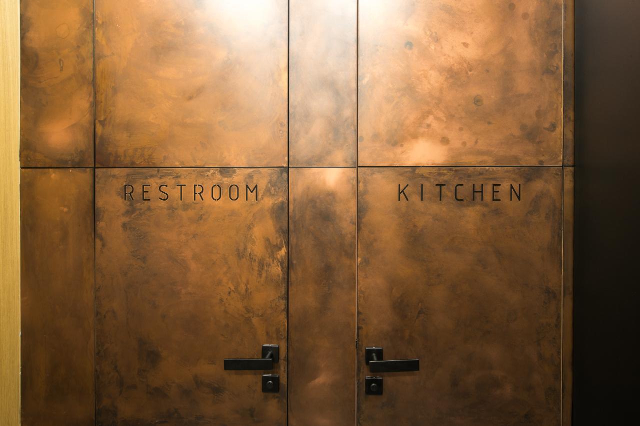 Jeho dvojičkou a kontrastným podkladom, na ktorom sa pult vyníma, je stena obložená patinovaným medeným obkladom, ktorý spolu s drevenými prvkami interiéru, dodáva celku naturálny a prírodný podtón.