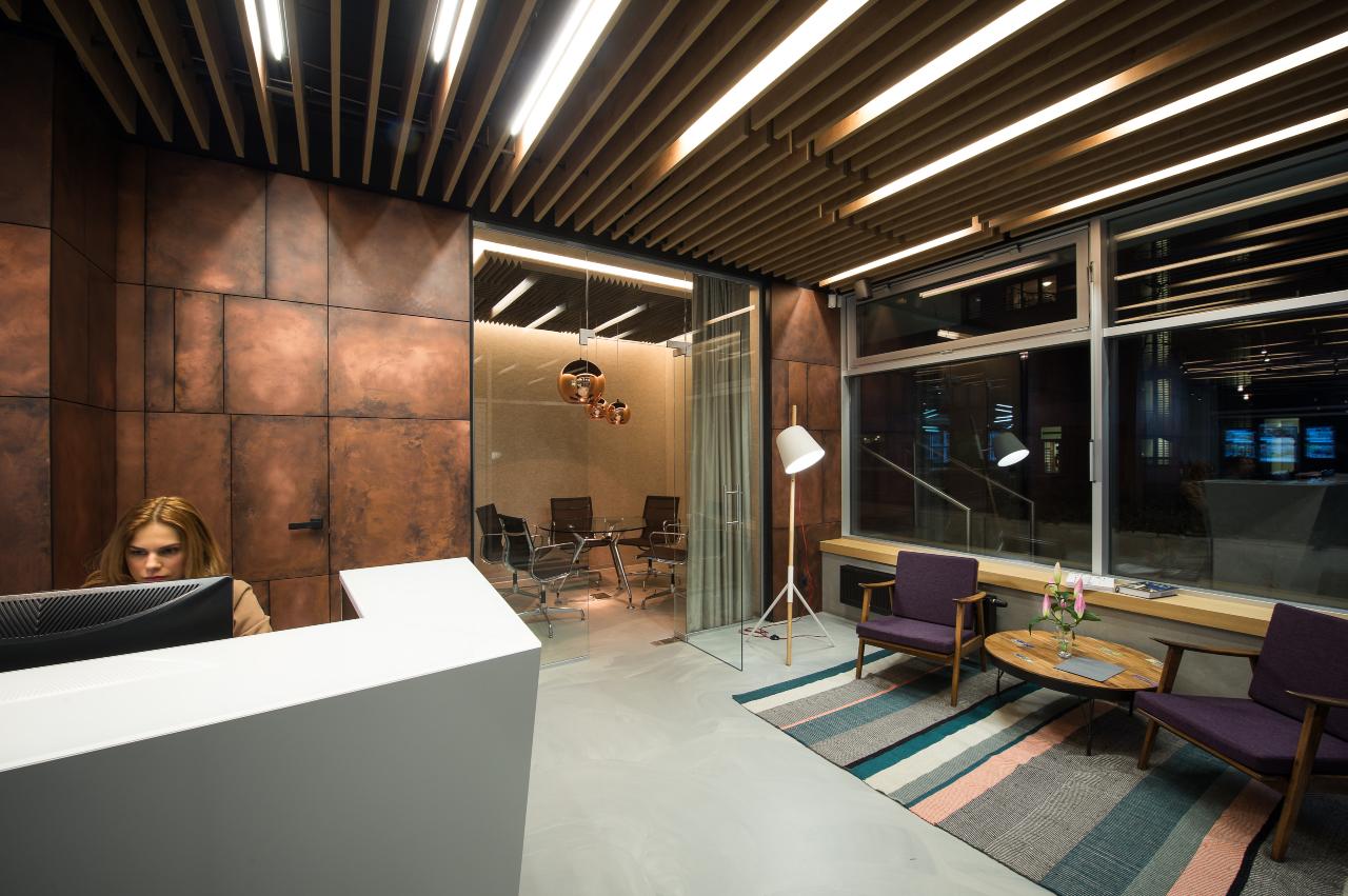 Najdominantnejším prvkom interiéru kancelárie je recepčný pult, ktorého ambíciou je byť istým poznávacím znamením celého priestoru.