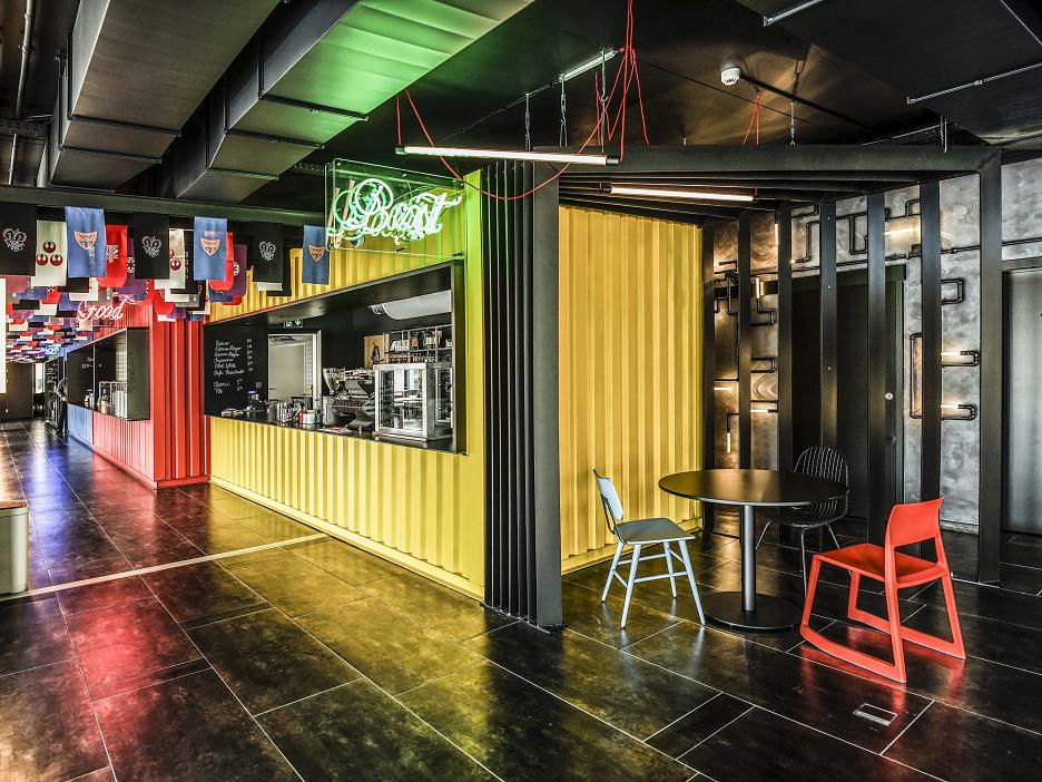 Priestor pozostáva z dvoch celkov predelených vloženým objektom, pripomínajúcim mestskú ulicu. Príprava jedla, kávy a piva je umiestnená vo farebných lodných kontajneroch, ktoré komunikujú s okolím otvormi s čiernou šambránou. Dubové a čierne stoly s farebnými stoličkami sú rozmiestnené od oceľových stĺpov lemujúcich „ulicu“ až po obvodový plášť, doplnený okennými šambránami s popínavou zeleňou. Betónový strop s priznanými inštalačnými médiami je zjednotený do čiernej farby. Doplnený je koordinovaným chaosom podvesených neónových svietidiel s červenými káblami.