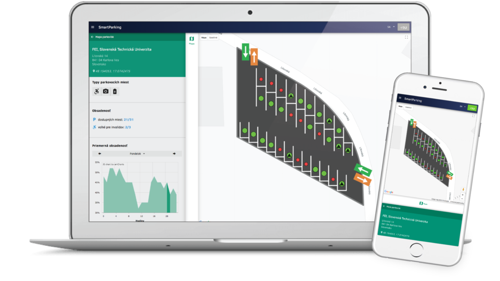 Zobraziť celú galériu (5)Bonusom je aj aplikácia, ktorá prináša informácie na jednej strane šoférom a na druhej strane mestám. Šoférom umožní nájsť rýchlo parkovacie miesto. Mestám zase zbierať a vyhodnocovať štatistiky o obsadenosti parkovacích miest v jednotlivých zónach a získať grafy a predpovedné modely obsadenosti. Bonusmi, ktoré sú možné podľa záujmu miest, sú integrovanie platby za parkovné do aplikácie, modul pre mestskú políciu, ktorý umožní kontrolu zaparkovaných vozidiel pomocou mobilnej aplikácie alebo modul, ktorý na základe predpovede vyťaženia parkovacích miest umožní upravovať cenu parkovania.