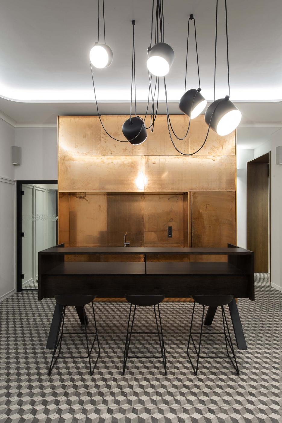Prízemie je verejnou časťou objektu s predajným miestom, spoločnou variabilnou kuchyňou a barom, ktorému dominuje medený kubus barovej skrine. Diferenciácia jednotlivých funkčných celkov je viditeľná hlavne v materiáloch podláh a typoch svietidiel.