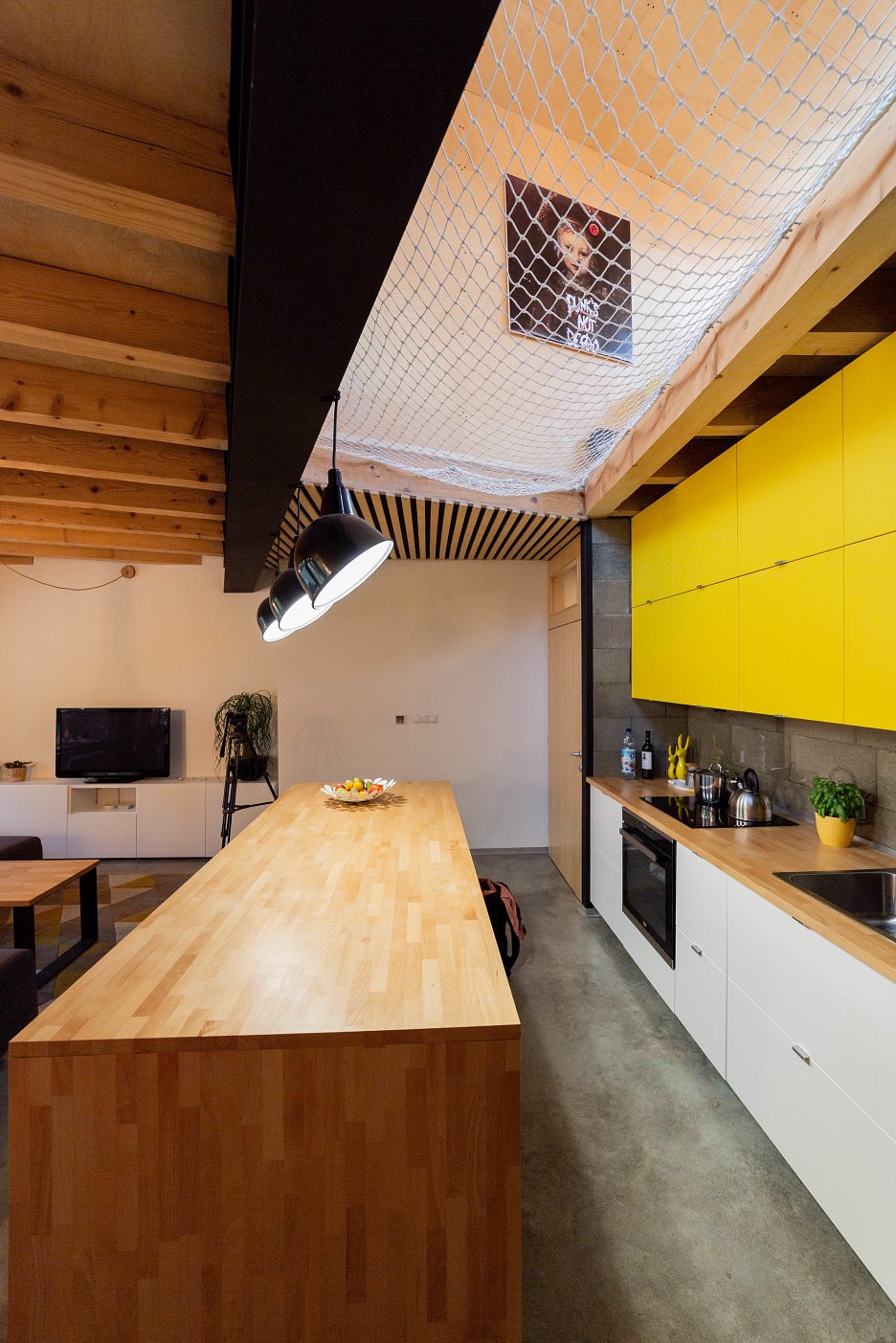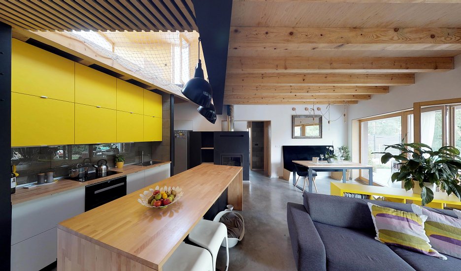 Nad kuchyňou je skrytá odpočinková miestnosť – preglejkový svetlík, ktorý presvetľuje celý priestor. Otvor v podlahe svetlíka je vyplnený bezpečnostnou sieťou, ktorá je využívaná aj na ležanie.