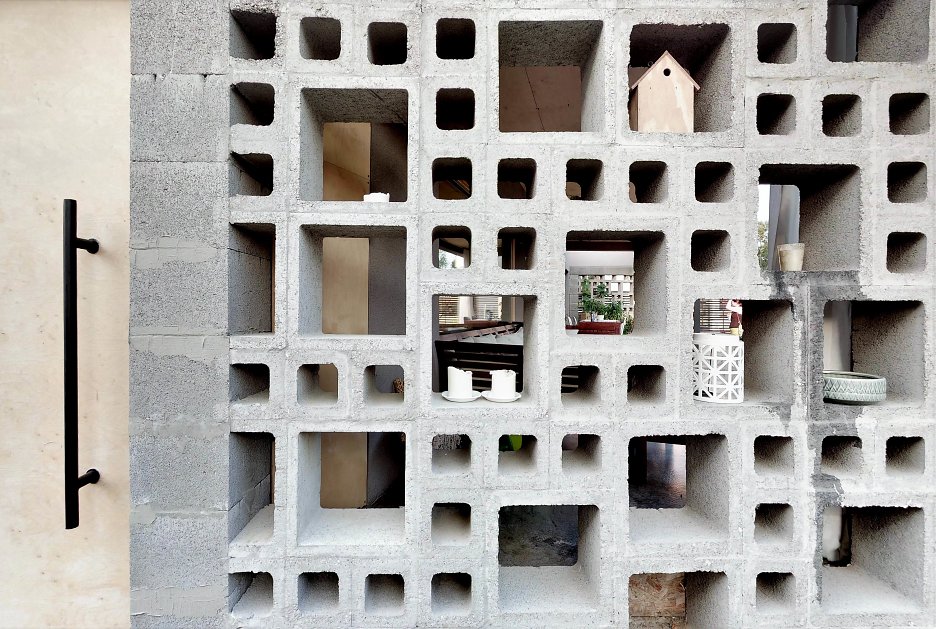 Hmotovo sme sa snažili zachovať pocit jednoliatej stavby, preto sú terasa aj garáž ukončené jednotiacou atikou, ktorá ich prepája so zvyškom domu. Steny garáže a terasy sú murované z betónových debniacich tvárnic ukladaných na kolmo. Raster otvorov rôznej veľkosti, prepúšťa svetlo a zároveň tvorí optickú bariéra od susedov.