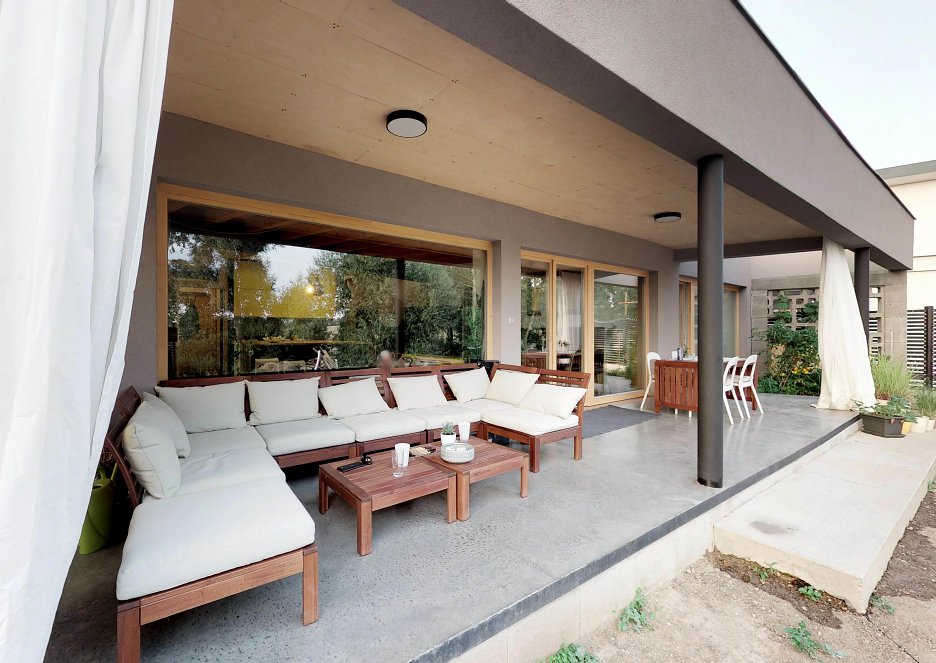 Okolo obytnej časti prebieha na západnej a južnej strane domu prstenec garáže, skladov a terasy. Terasa prebieha pozdĺž celej južnej fasády domu, z dvoch tretín je zastrešená. Otvorená časť slúži ako okrasná záhradka.