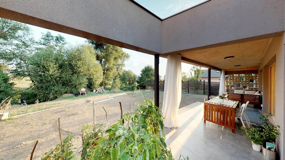 S nákladmi pohybujúcimi sa tesne pod úrovňou šesťsto eur na meter štvorcový je výsledok viac než príjemný. Rodinný dom v novej zástavbe na okraji obce Teriakovce, päť kilometrov východne od centra Prešova. Záhrada zvažujúca sa smerom k zelenému pásu stromov a potoku. Súkromie vymedzené polotransparentným rastrom betónových tvárnic.