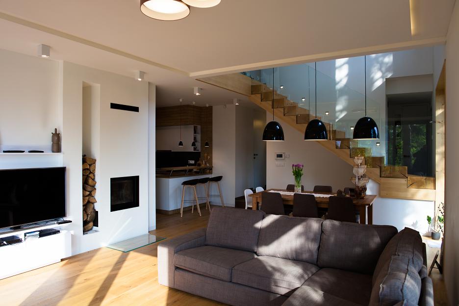 Odtiaľ sa priamo vchádza na terasu a do záhrady. Krb je srdcom priestoru a nasáva vzduch z exteriéru cez komoru, ktorá sa súčasne vetrá. Kuchyňa má okno do priestoru medzi plotom, kde sa podarilo vytvoriť malú japonskú záhradku.