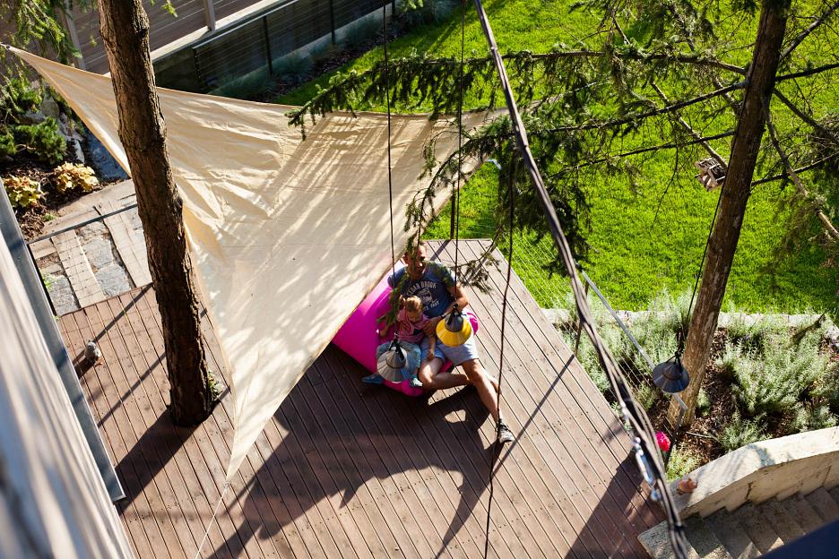 Mohutná drevená konštrukcia, postavená bez žeriavu, nesie exteriérové schodisko, tvorí rastúcu zelenú stenu ako bariéru od susedného domu, slúži na uchytenie hojdačiek a hlavne dotvára architektúru domu. Svojím vzhľadom umocňuje materialitu a návrat k prírode.