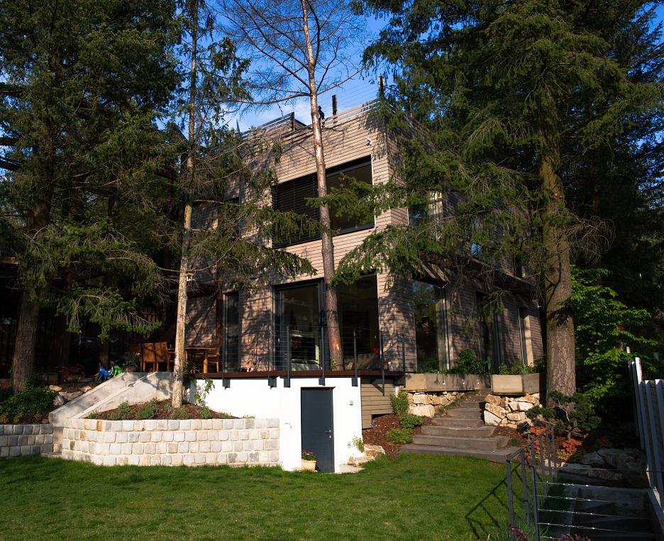 Výškou a zošikmením sa chceli architekti priblížiť okolitým ihličnanom. Logisticky aj fyzicky bolo náročné v tomto teréne manipulovať s drevenými panelmi a nezničiť pritom žiadny strom. Tu sa ukázala výhoda, keď je architekt investorom, stavebným dozorom a stavbyvedúcim zároveň.