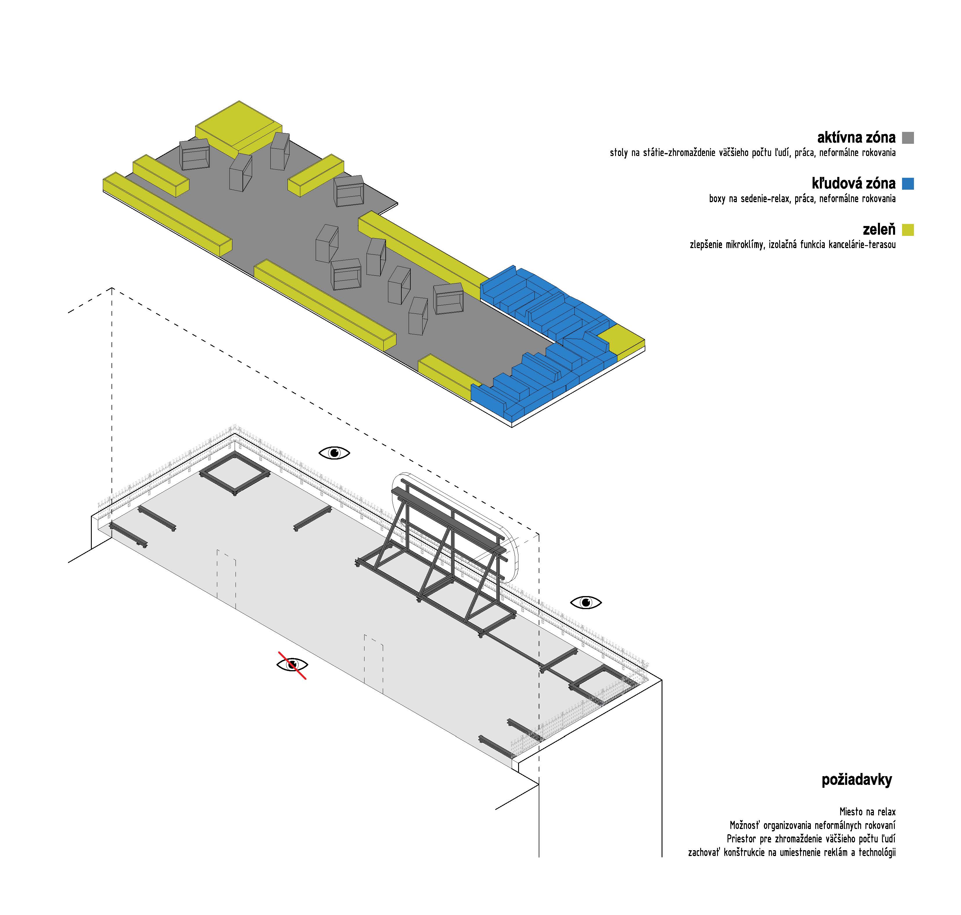 Priestor je rozdelený na dve zóny: oddychovú, orientovanú s výhľadom na zeleň – Sad Janka Kráľa a aktívnu, orientovanú s výhľadom na Staré Mesto. Terasu tvorí drevená platforma z ktorej vystupuje pódium s boxami na sedenie, kubusy so zeleňou a stoly.
