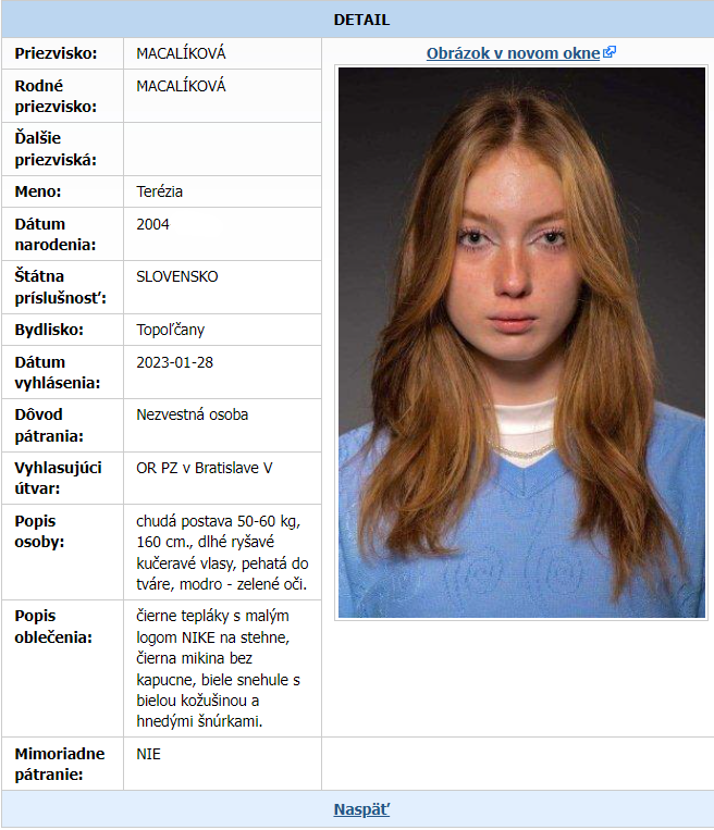 Terézia Macalíková má 18 rokov a navštevuje umeleckú školu v Topoľčanoch. Do Bratislavy chodila za svojím priateľom. Ak máte o nezvestnej akékoľvek ďalšie informácie, neváhajte a kontaktujte políciu na telefónnom čísle 158 alebo linku tiesňového volania 112.