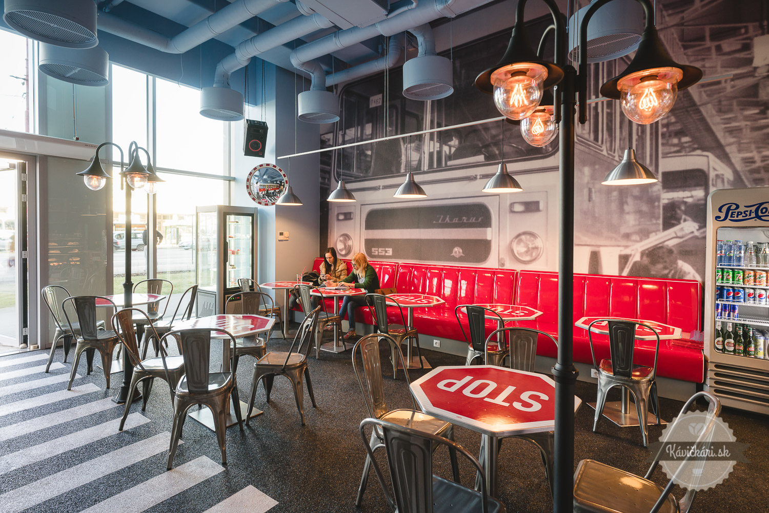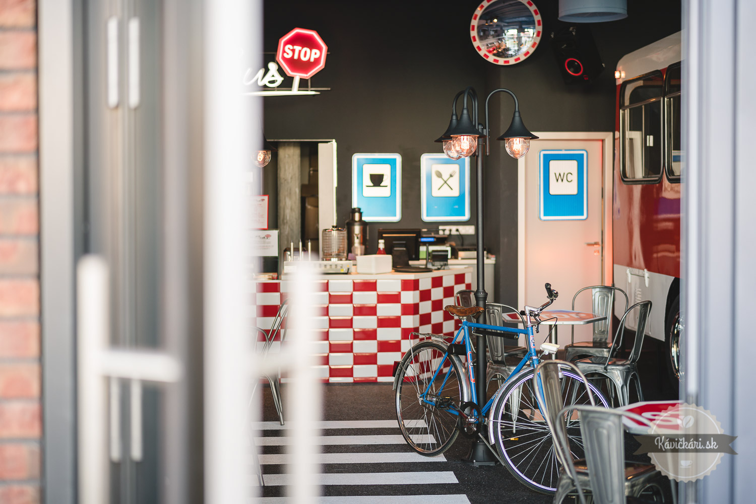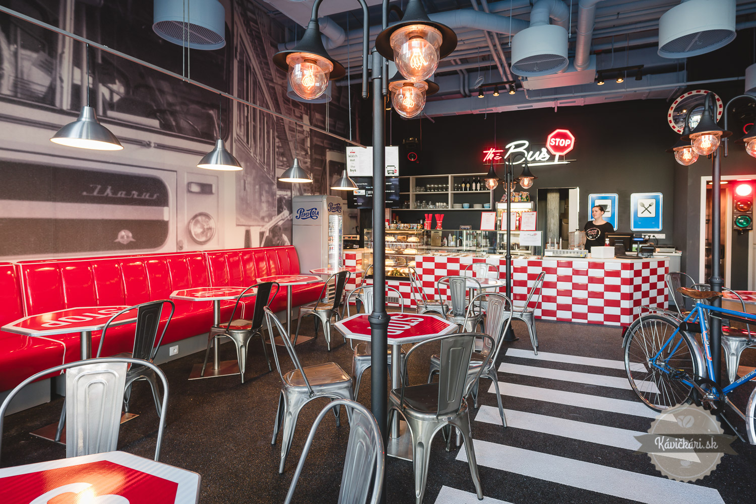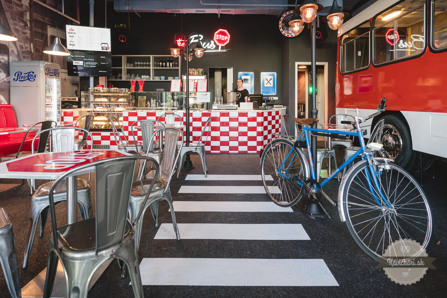 Prvé, čo vás v živej, farebnej a nepochybne retro kaviarni v štýle amerických dinerov upúta, je veľký červený autobus zaberajúci takmer celú pravú časť podniku. Prejdete k nemu po unikátnej (hygienicky nezávadnej) „asfaltovej“ podlahe, okolo old-school pouličných lámp a modrého retro bicykla opretého o jednu z nich. V autobuse nájdete bar a barové stoličky a prekvapivo i niekoľko popolníkov, dym z cigariet však efektívne a rýchlo zlikviduje výkonné odsávanie. Príjemnú atmosféru vytvárajú ručne maľované ilustrácie na stenách – nájdete tam i rozkošného mopslíka, s ktorým sa náš kávičkár Jimmy určite príde čoskoro skamarátiť.