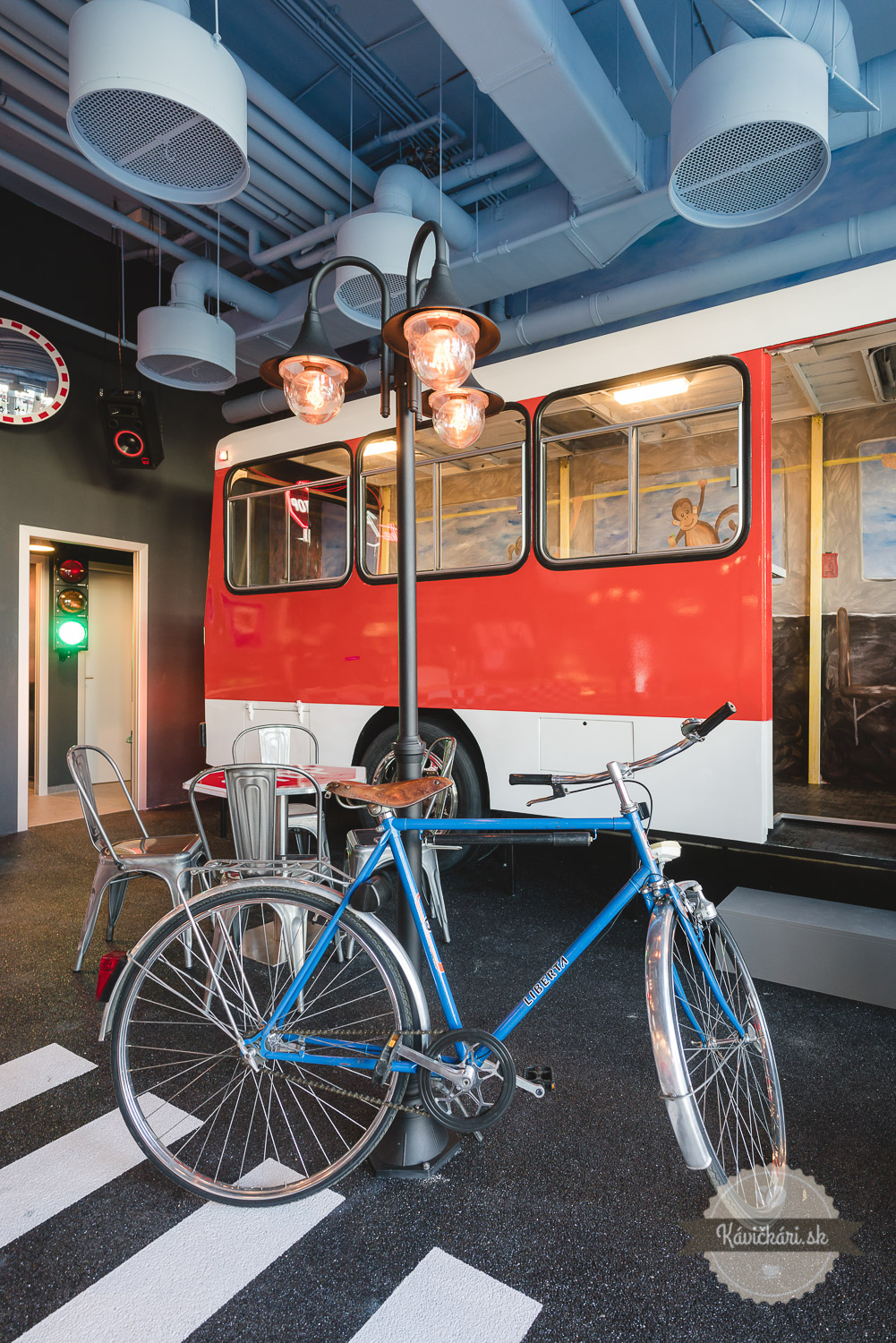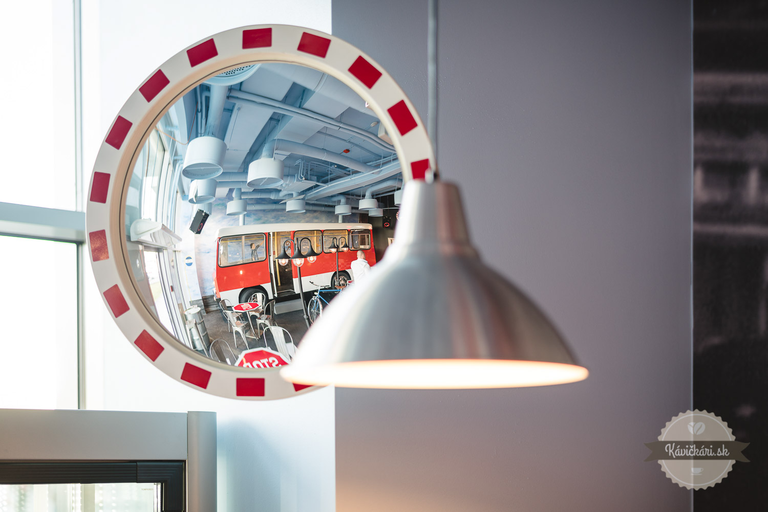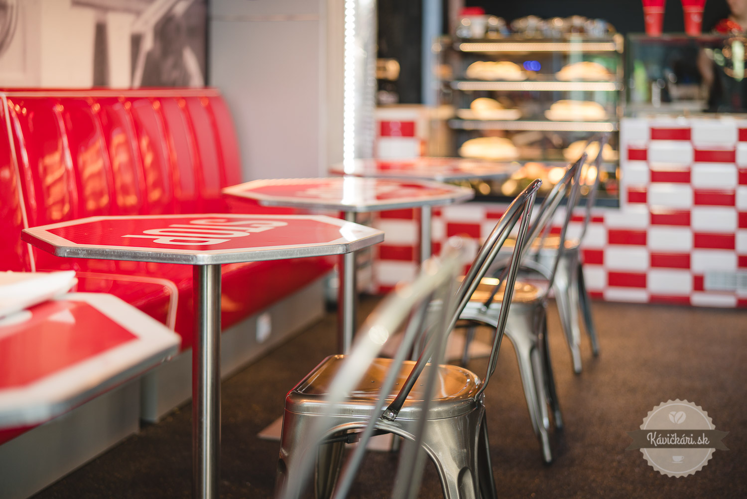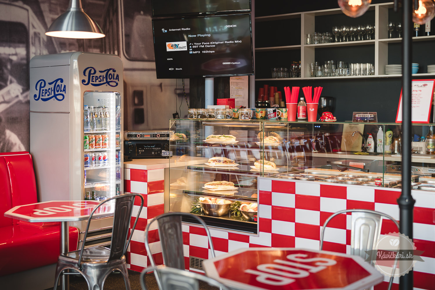 Prvé, čo vás v živej, farebnej a nepochybne retro kaviarni v štýle amerických dinerov upúta, je veľký červený autobus zaberajúci takmer celú pravú časť podniku. Prejdete k nemu po unikátnej (hygienicky nezávadnej) „asfaltovej“ podlahe, okolo old-school pouličných lámp a modrého retro bicykla opretého o jednu z nich. V autobuse nájdete bar a barové stoličky a prekvapivo i niekoľko popolníkov, dym z cigariet však efektívne a rýchlo zlikviduje výkonné odsávanie. Príjemnú atmosféru vytvárajú ručne maľované ilustrácie na stenách – nájdete tam i rozkošného mopslíka, s ktorým sa náš kávičkár Jimmy určite príde čoskoro skamarátiť.