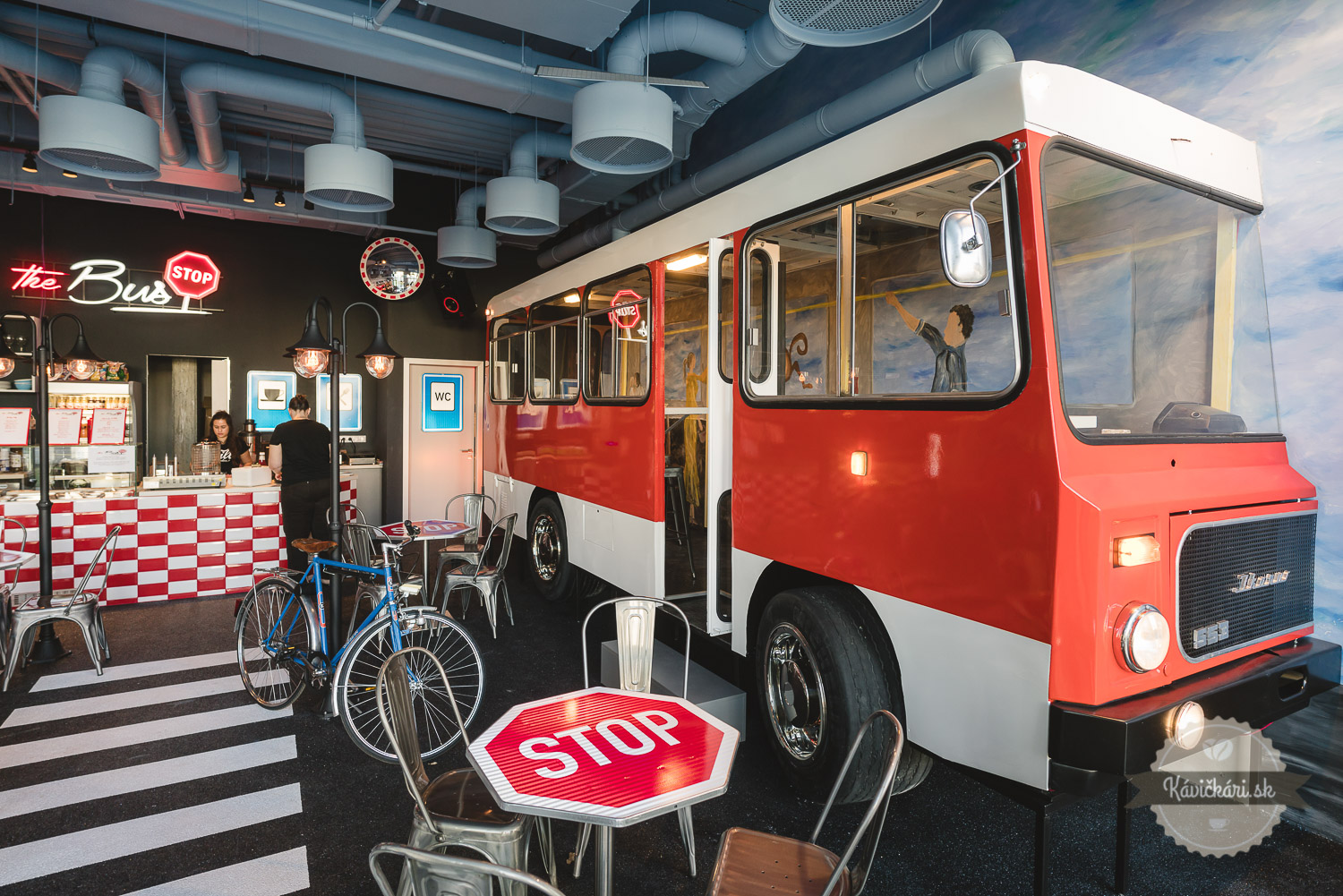 Ten je, mimochodom vyrobený zo skutočných dopravných značiek STOP, ktoré majiteľ zložito zháňal s pomocou dopravného podniku. Ku kockovanému červeno-bielemu baru pod výrazným neónovým logom The Bus Stop vás neprivedie nič iné ako biela zebra na asfaltovej podlahe. Milkshake, skvelý koláčik či čerstvo pripravenú bagetu si môžete vychutnať pri kovových stoloch či na prekvapivo mäkkej lesklej červenej sedačke.