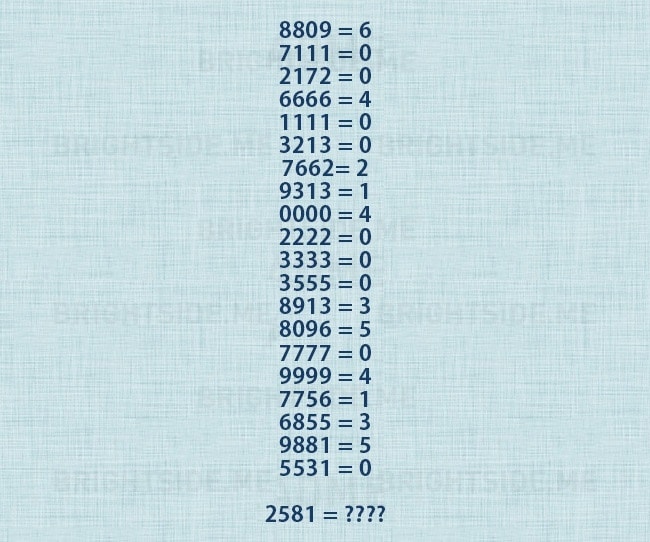 Skús spočítať kruhy na každom zo 4-ciferných čísiel. Také číslo 6 má jeden, 8 má 2 a 6889 ich má 6. Posledné číslo ich má 2.