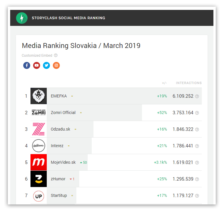 Na čele rebríčka podľa interakcii na sociálnych sieťach svieti náš zábavný portál Emefka, ktorý sa na vrchole rebríčka drží dlhodobo. Portál má za marec 6,1 miliónov interakcií a oproti minulému mesiacu vzrástli o 19 percent.