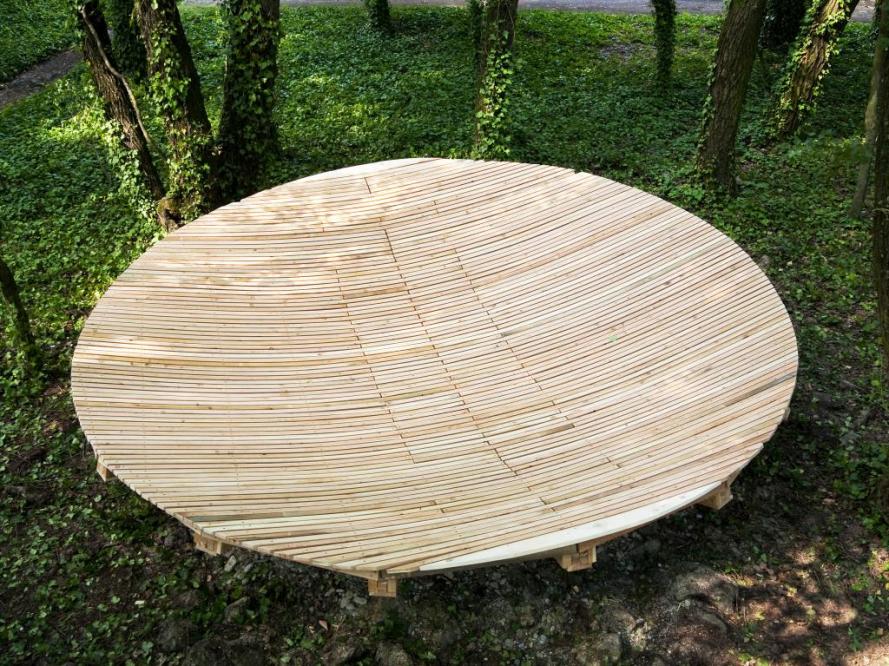 Na prvý pohľad ťažko identifikovateľná drevená štruktúra vznikla v rámci workshopu 1:1, ktorého cieľom je „vytrhnúť študentov zo stereotypnej práce na ateliérových zadaniach a ponúknuť im iný formát učenia sa praxou, priamym podieľaním sa na vzniku reálneho projektu v mierke jedna k jednej,“ tvrdí portál ArchInfo. Môže slúžiť na posedenie pod korunami stromov, alebo na hocičo iné, čo ťa napadne.