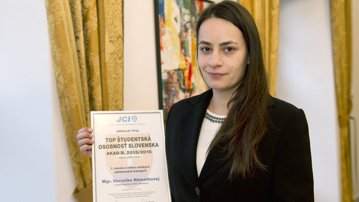 Za svoj výskum v oblasti liečby špecifických nádorových ochorení si v minulom roku odniesla ocenenie v súťaži Študentská osobnosť Slovenska, ktoré každoročne vyhlasuje nezisková organizácia Junior Chamber International pod záštitou prezidenta Slovenskej republiky. Veronika vyvíja systém pre vývoj vysoko selektívnych chemoterapeutík, ktorý sa zameriava čisto na nádorovú bunku bez toho, aby poškodil zdravé tkanivo. Takýmto spôsobom sa potlačia vedľajšie účinky chemoterapeutickej liečby, ktorými pacienti momentálne trpia.