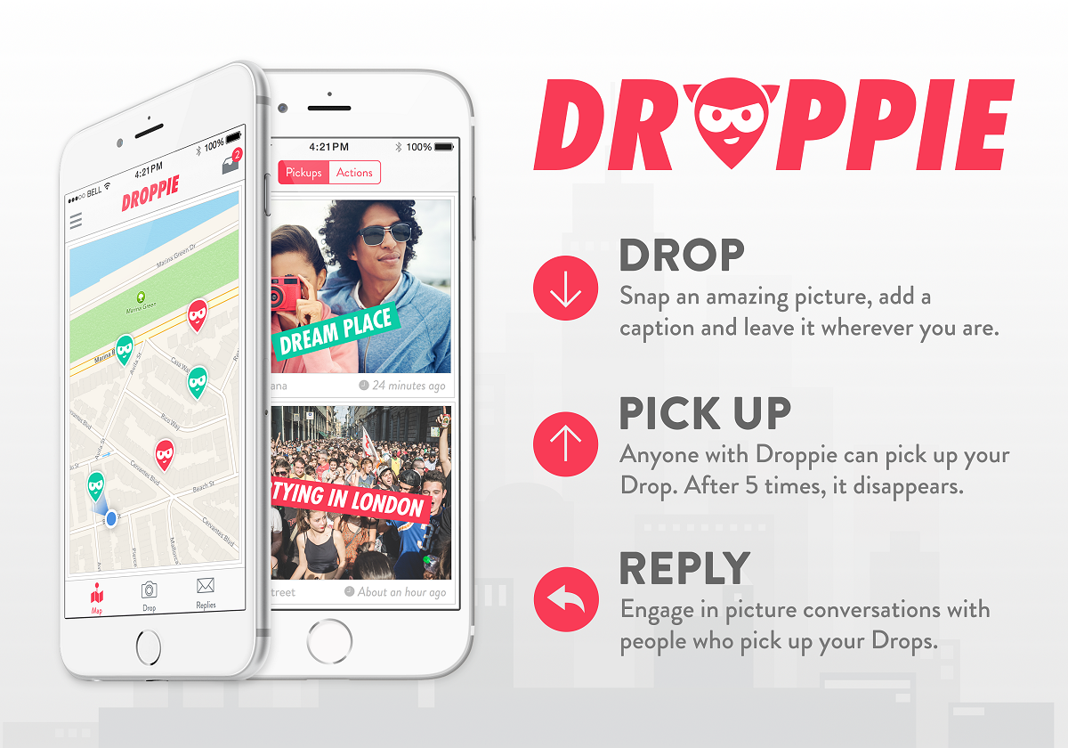 Cieľom Droppie bolo vytvoriť unikátnu sociálnu sieť, ktorá by spájala ľudí pomocou zdieľania fotografií, ktoré by užívatelia „dropli“ na určitom mieste. Každý kto by okolo daného miesta prešiel by dostal notifikáciu s danou fotografiou a profilom osoby, ktorá ju tam nechala.