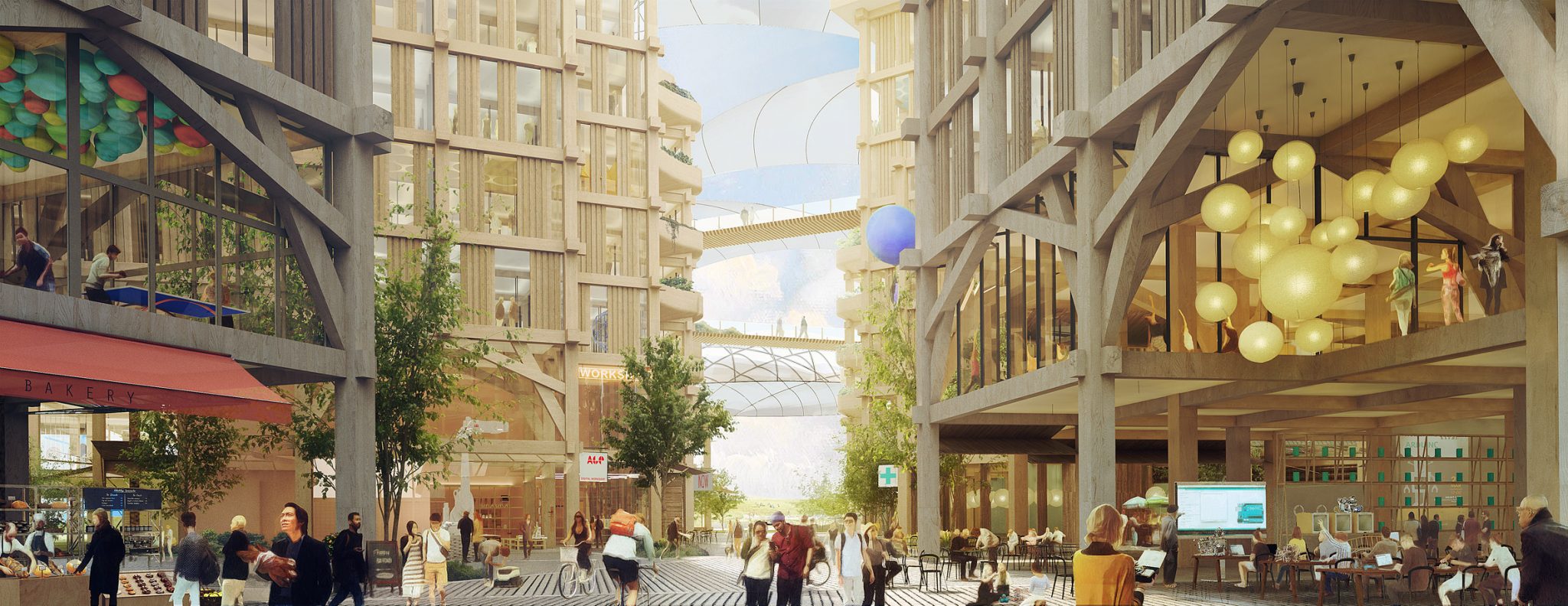 Vizualizácia exteriéru od štúdia Snøhetta ponúka pohľad na niekoľko výškových budov, ktoré charakterizuje zakrivená štruktúra. Zatiaľ síce nie je presne známe, či budú slúžiť ako business budovy, alebo ponúknu byty, ktoré sú taktiež jedným z plánov nového „dreveného mesta“. Návrh interiéru projektu odhaľuje drevené konštrukcie budov, ktoré budú súčasťou nádvoria a jednej z verejne dostupných oblastí novej mestskej štvrti, ktoré budú dotvárať lavičky a rôzna zeleň.