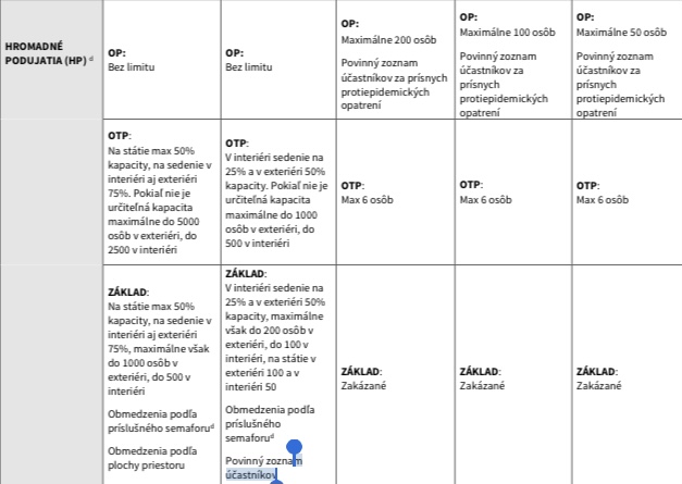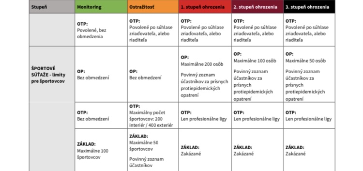 Pri športových podujatiach, ktoré sa budú konať v červených, bordových a čiernych okresoch v režime OP, sa kapacita výrazne obmedzí. V červených okresoch je limit maximálne 200, v bordových maximálne 100 a v čiernych maximálne 50 ľudí.