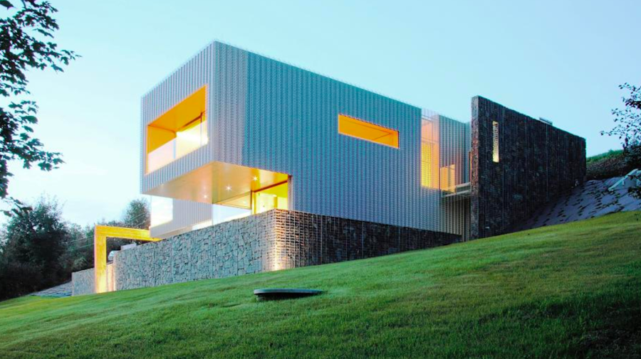 To však ťažko tušiť pri pohľade z ulice alebo zo záhrady. Fasáda z ohýbeného perforovaneho plechu pripomína čipkársku tradíciu regiónu. Tento prvok však nie je samoúčelný a neslúži iba na efekt. Profilovaný hliníkový plech – druhá koža objektu – slúži ako slnolam a chráni pred prehriatím poslednú obkladovú vrstvu z alucobondu. Zároveň funguje ako vetrolam. Bezúdržbový exteriér dopĺňajú gabionové koše naplnené miestnym kameňom.