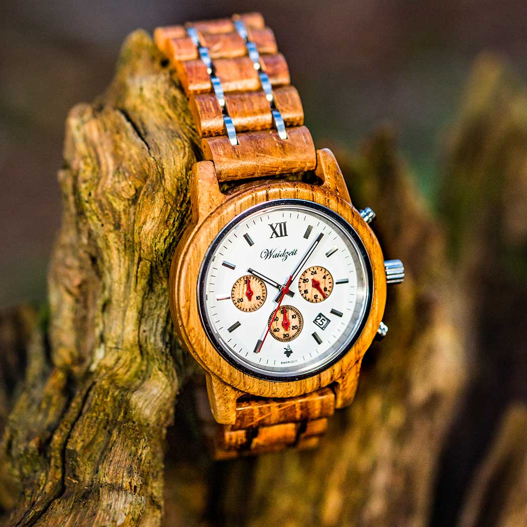 Drevo si vyberajte starostlivo – Pri výbere drevených hodiniek dbajte na to, aby bol druh dreva odolný a pevný. Značka Waidzeit používa na výrobu hodiniek tie najkvalitnejšie materiály z horského rakúskeho prostredia. Cez pevné santalové drevo až po klasický orech. Vyberie si každý.