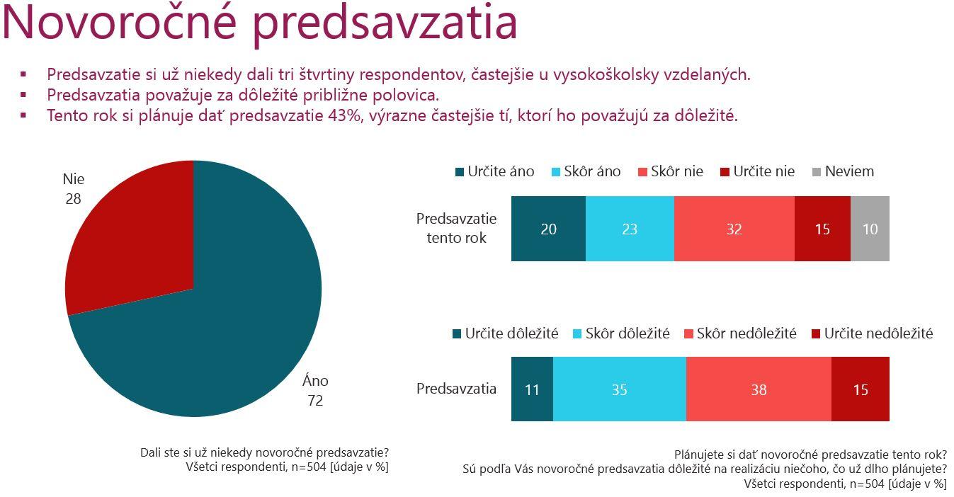 Novoročné predsavzatia si podľa prieskumu dáva dalo niekedy v živote na Slovensku viac ako 72 percent ľudí. Vyplýva to z prieskumu agentúry STEM/MARK, ktorý si u nás dala vypracovať sieť výživových poradní NATURHOUSE.