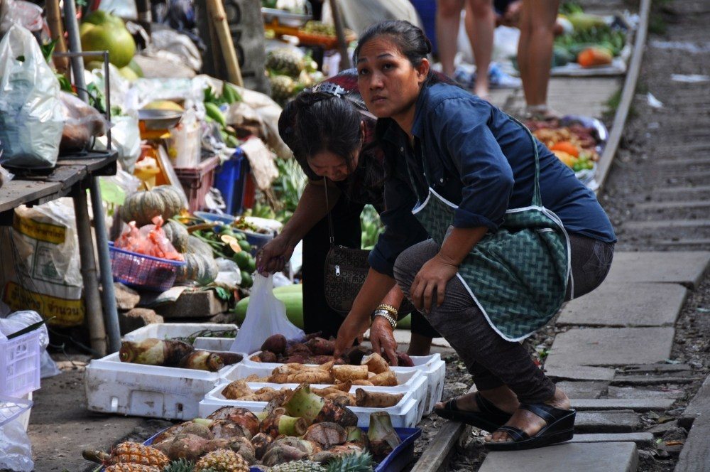 Z ničoho nič sa trhovisko postaví na nohy a ruch naokolo sa stane intenzívnejším než obvykle. Tí, ktorí majú svoje plachty s ovocím a zeleninou na koľajniciach ich vezmú preč. Stánky sa pomocou koliesok stiahnu, tienidlá sa zložia a za pár sekúnd vznikne na trhovisku ulica. Keby som netušil, že má prísť vlak, myslel by som si, že sa blíži nejaká živelná pohroma a všetci sa chystajú na útek. Z diaľky sa ozve trúbenie vlaku a trvá to len niekoľko desiatok sekúnd, kým sa odrazu spoza rohu vynorí žltý kolos. Priamo cez trhovisko vedie totiž železnica Mae Klong, ktorej vlak začína v Bangkoku a tu v Samut Songkhram má konečnú.