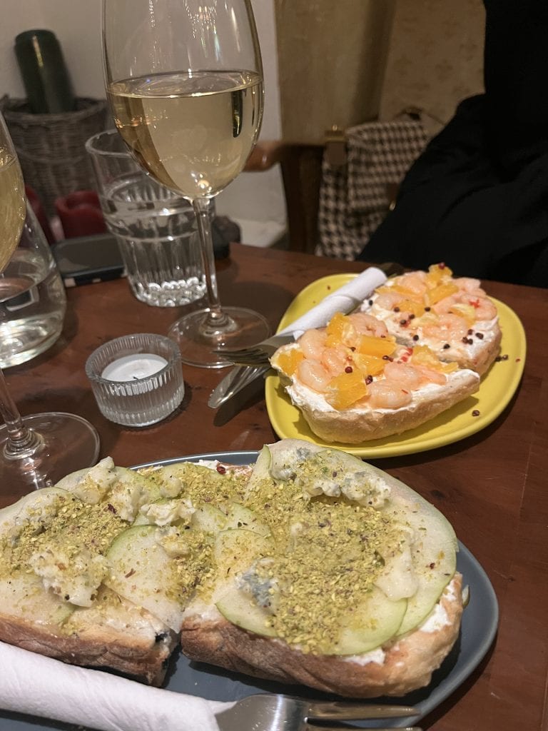 Z pokrmov sme si k bielemu vínu vybrali bruscetty, ktoré podnik odporúča na konzumáciu práve k danému vínu. Ochutnali sme bruscettu s krevetami, pomarančom a sweet chilli omáčkou a bruscettu s gorgonzolou a hruškou. Obe bruscetty mali ako základ cream cheese. Cenovo nás jedna bruscetta vyšla na približne 6,50 eura.