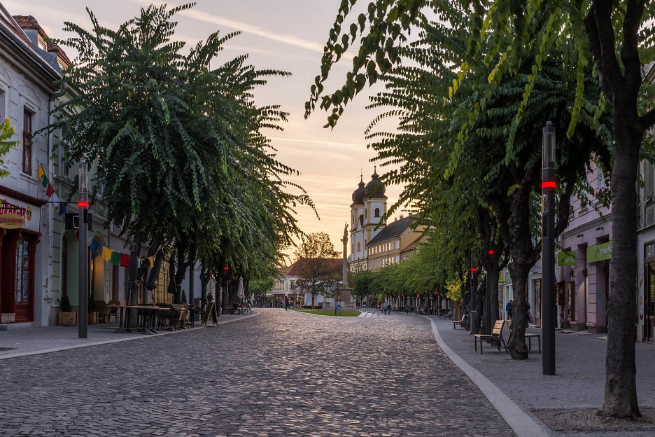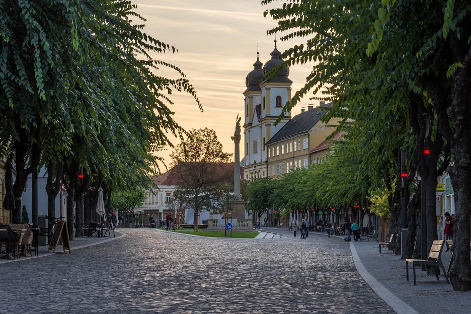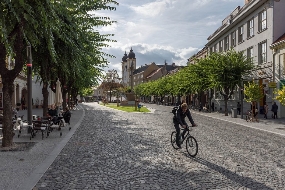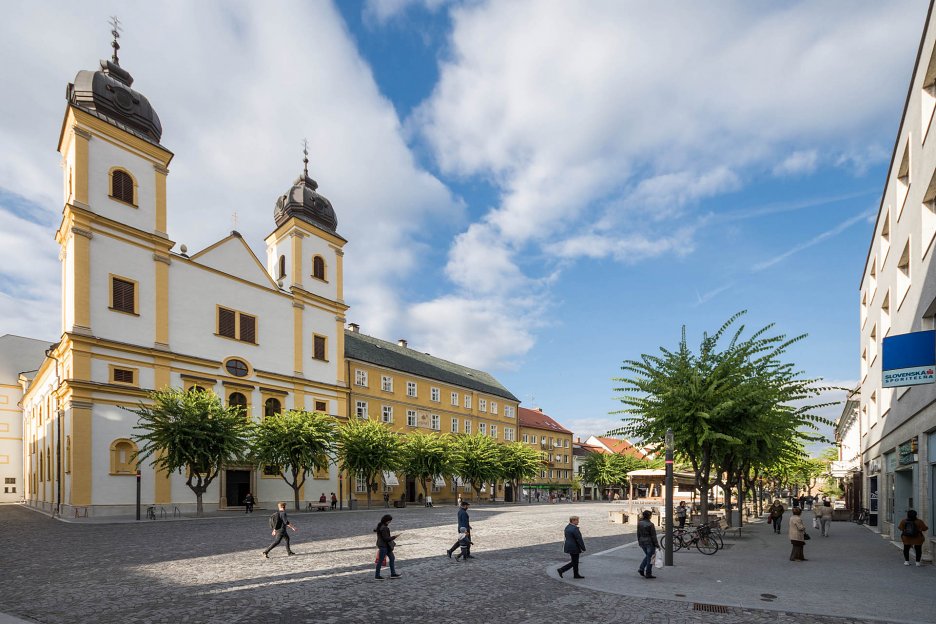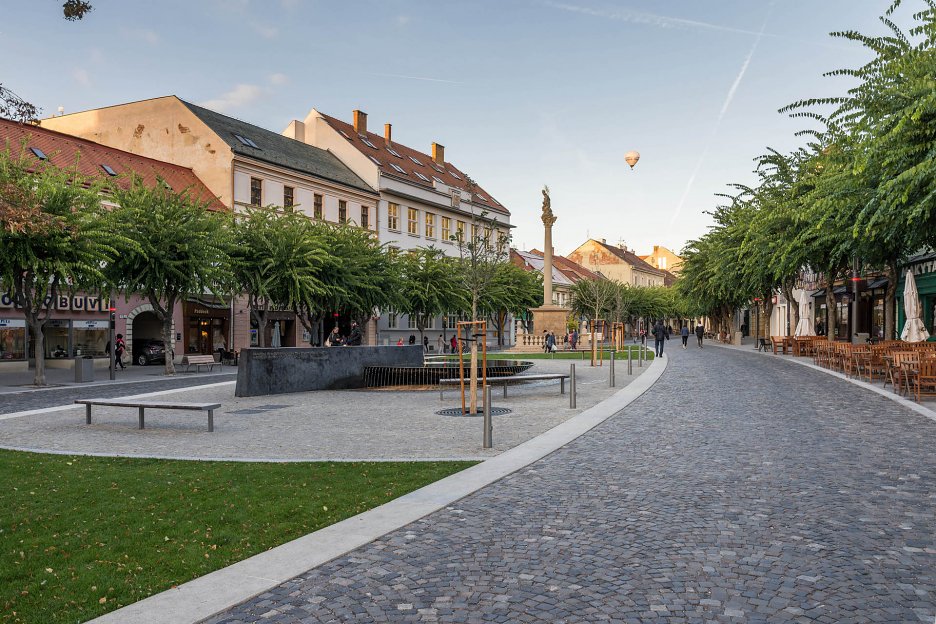 Záměrem našeho projektu bylo tyto přednosti vyzdvihnout, posílit, očistit a zasadit do nového, současného kontextu. Šlo především o nově přeskládaný povrch z původních kostek, lemovaný novými chodníky ze štípané mozaiky podél obchodních parterů. Vytvořili jsme nové, reprezentativní ‚srdce‘ náměstí v podobě centrální eliptické plochy z řezaných kostek ve světlém odstínu a travnatých koberců. Toto místo nese další vrstvu vzpomínek – kromě barokního morového sloupu i připomínku doby dávné, avšak mající celoevropský význam – římskou minulost města Laugaricio. Tato minulost je připomenuta ‚Zlatou kašnou Marca Aurelia‘. Dalším z atraktivních prků, posilujících význam náměstí je bronzový plastický model města ve formě sochařského díla, umístěného v prostoru po pravé straně vstupu do chrámu.“