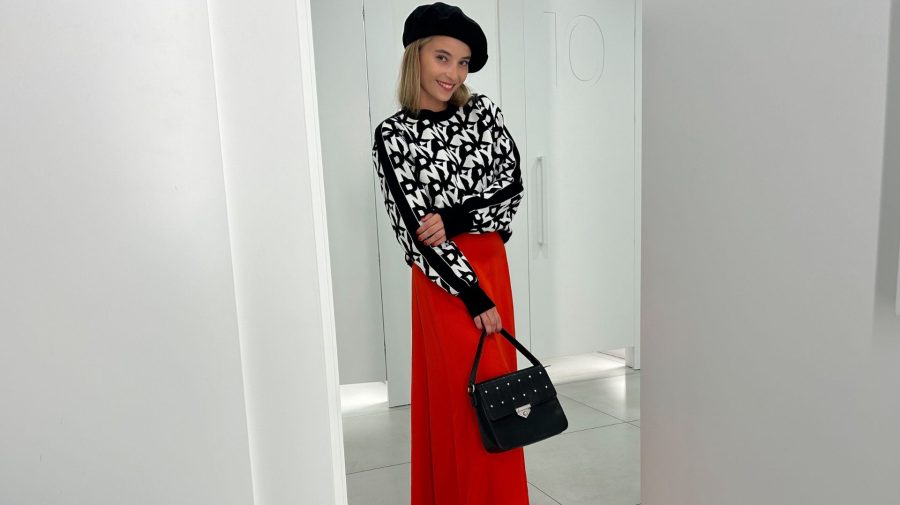 Základom outfitu do 200 € je už spomínaný čiernobiely sveter, ktorý sa dá skvele kombinovať so sukňami. Lucia ho skombinovala s červenou saténovou sukňou, ale výborne bude vyzerať aj s kratšími, aktuálne veľmi trendovými skladanými sukňami či nohavicami padavého strihu.