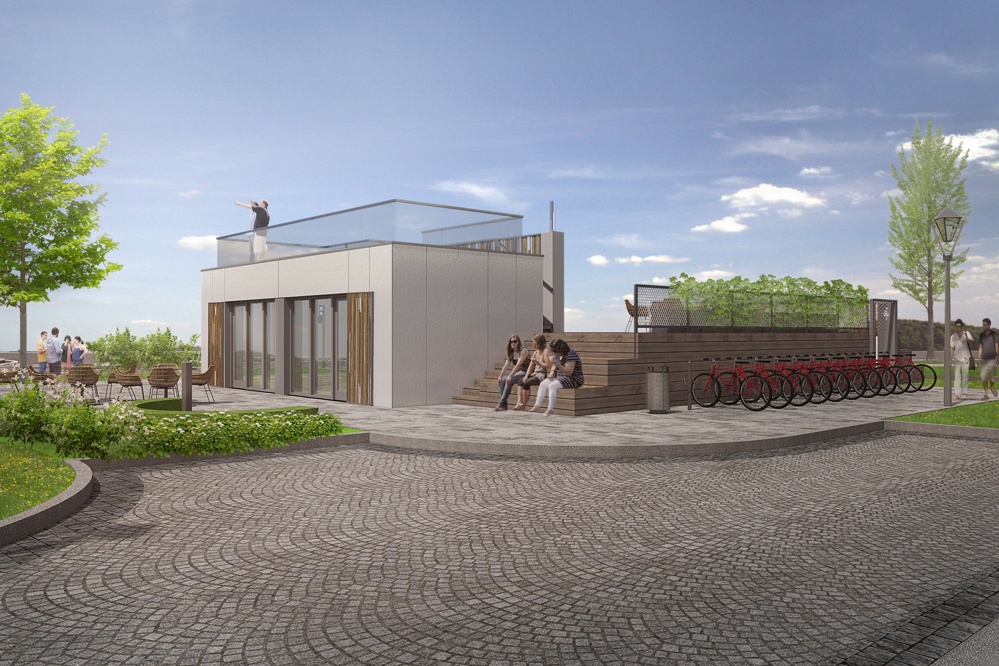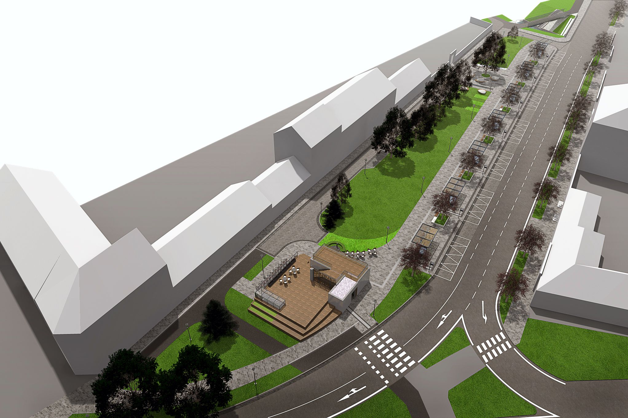 Jestvujúce predajné stánky budú nahradené centrálnym objektom, ktorý by mal spájať funkciu komerčného priestoru aj verejných WC. Plocha strechy môže slúžiť ako vyhliadková terasa otvorená smerom k parku.