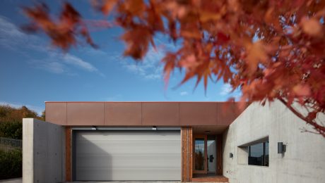 Hlavný vstup k domu je otvorený, bez oplotenia, a slúži na vjazd áut aj na peší príchod. Od okolia je dláždená plocha vchodovej časti oddelená betónovými stenami s priehľadmi do súkromnej časti záhrady. Tieto steny zároveň spájajú vnútorné priestory domu s okolím.