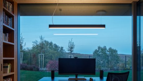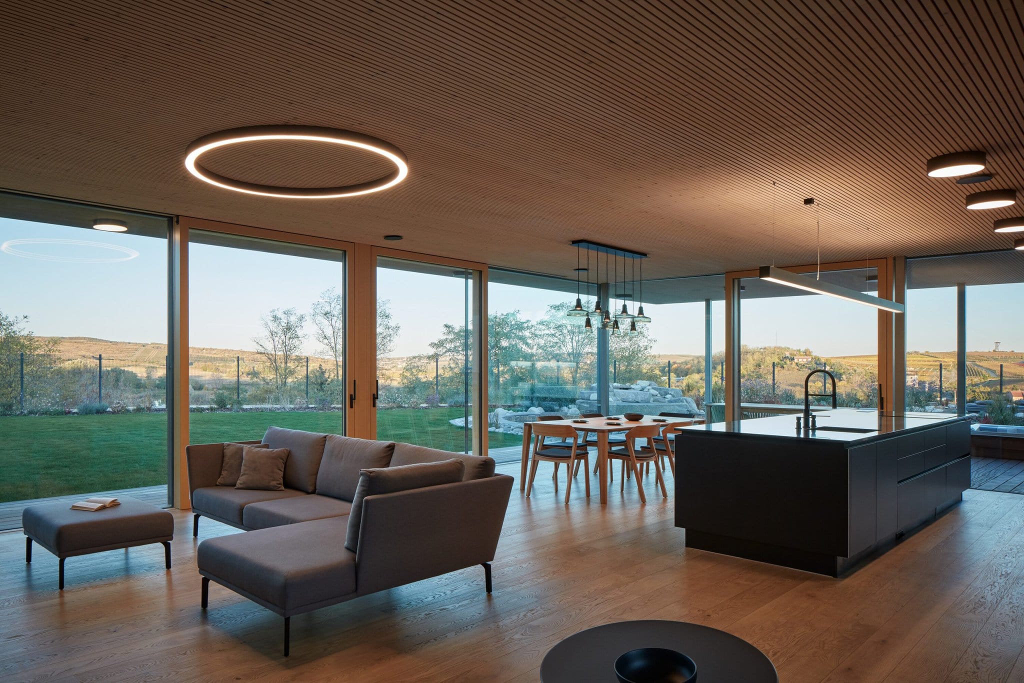 Vďaka tomu je zaistené prirodzené svetlo v chodbe, vedúce do izieb a kúpeľne. Hlavný obytný priestor s veľkou kuchyňou, jedálňou a posedením je maximálne otvorený smerom von. Tento efekt ešte umocňujú drevené akustické panely na strope, ktoré „prechádzajú“ cez bezrámové okná z interiéru, do podhľadu strechy v exteriéri.