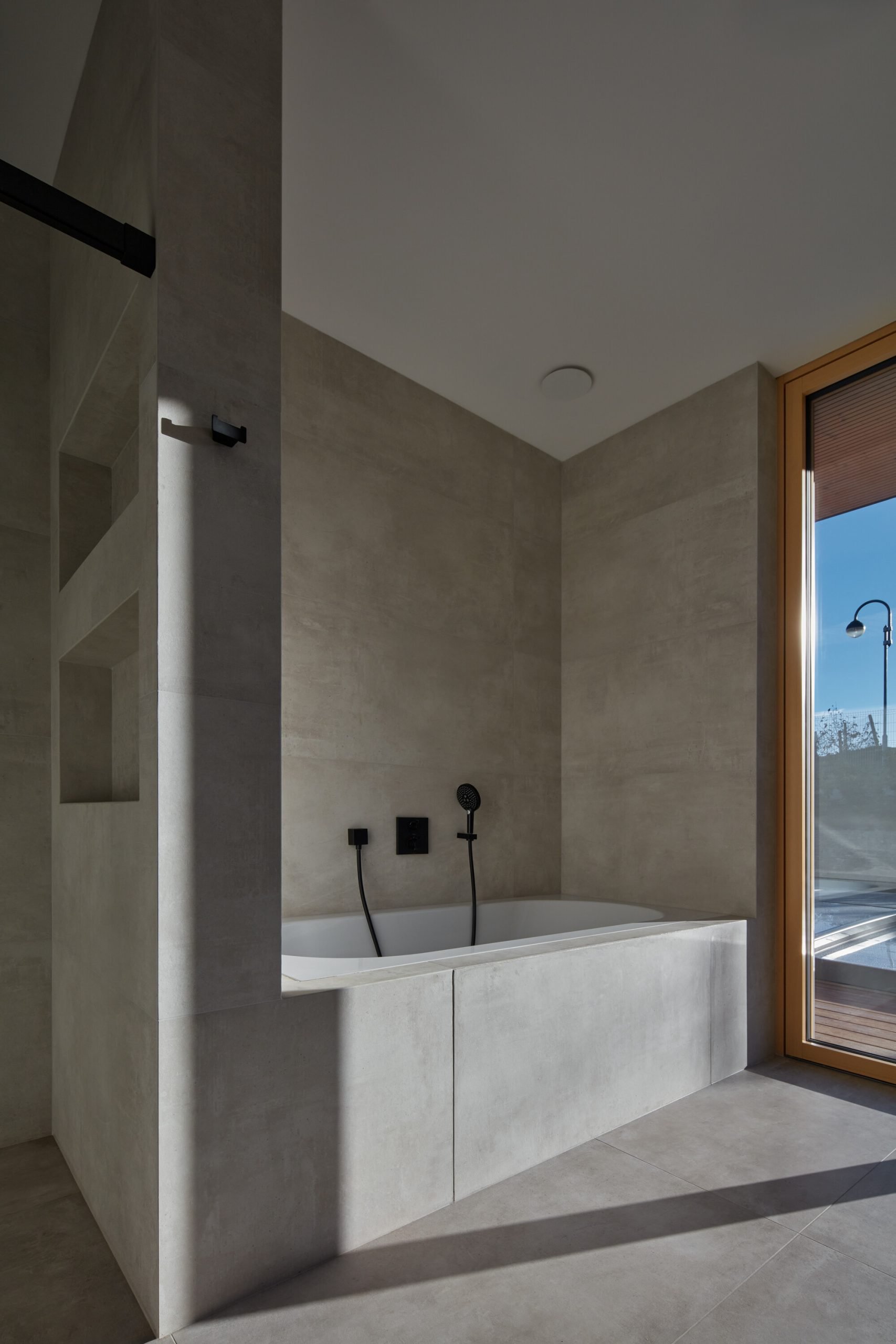 Tým sa celý priestor vo vnútri aj vonku opticky zväčšuje a prepája. V rohu obývacej miestnosti je krbová vložka s obstavbou, ktorá má vzhľad pohľadového betónu. Praktickou súčasťou domu je technická miestnosť so zázemím pre technológie, práčku a sušičku, spolu s pracovnou doskou na skladanie bielizne.