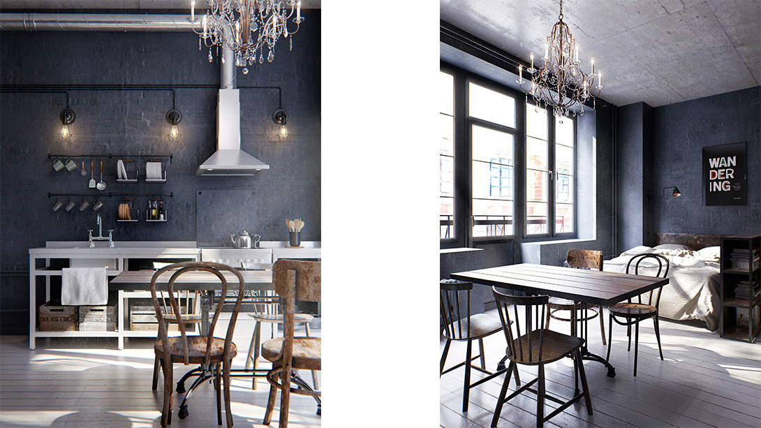 Malý priestor poskytuje všetko, čo v spálni človek potrebuje – postel, svetlo, odkladací priestor, ktorý má aj funkciu predelenia priestoru – delí spací kútik a obývačku. Kuchyňa je riešená funkčne, nie je tam prebytok skriniek, sú tam potrebné spotrebiče, pracovná plocha a vešiaky na kuchynské potreby. Ku kuchyni neodmysliteľne patrí jedálenský stôl a stoličky. Nad stolom je mierne extravagantný krištáľový luster. Oba priestory sú orientované k oknám, čím majú dostatok prirodzeného svetla počas celého dňa.