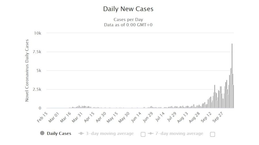 Od začiatku septembra epidémia v Česku silnie a padlo niekoľko rekordov. Sobota priniesla víkendový rekord – 4 635 infikovaných, v piatok zase zaznamenali dosiaľ najvyšší prírastok prípadov, a to konkrétne 8 618. Vysoký počet prípadov súvisí aj so zvýšeným počtom testov, dosiaľ ich v krajine vykonali takmer 1,6 milióna.