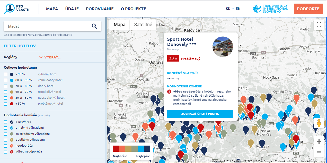 Transparency International Slovensko prichádza s novým webom, ktorý odhaľuje mená majiteľov väčšiny slovenských hotelov. Zaujímavosťou je, že stránka má schopnosť analyzovať nie len majiteľov, ale aj prevádzkarov jednotlivých hotelov a poukazuje na ich transparentnosť a dôveryhodnosť.