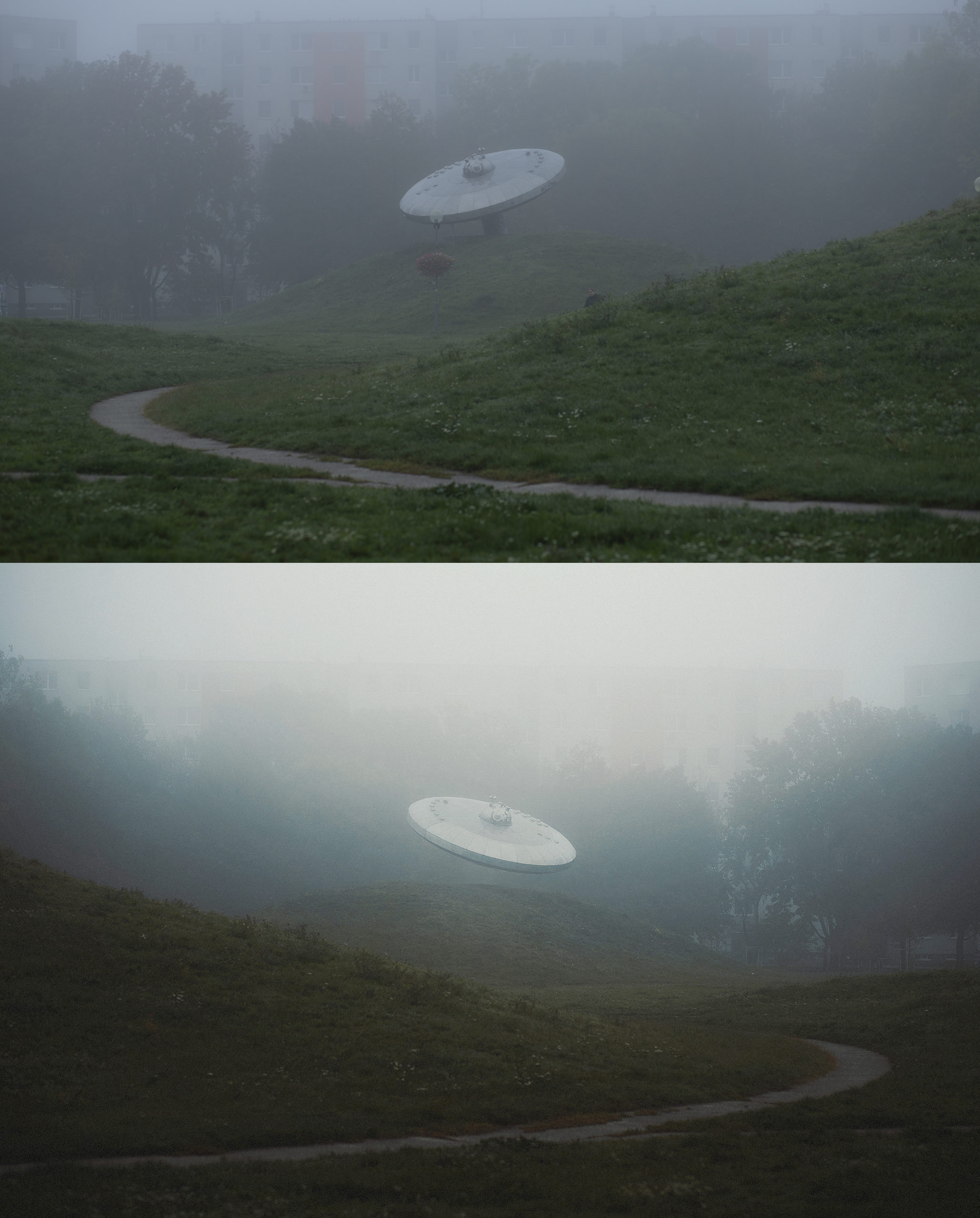 UFO je ďalším Bratislavským unikátom, o ktorom vie málokto. Kulkovský sa preto rozhodol na sochu upozorniť takýmto nezvyčajným spôsobom. Záhadnú atmosféru fotografie pomohla dotvoriť hustá hmla, ktorá počas tvorby záberu pokrývala ulice hlavného mesta.