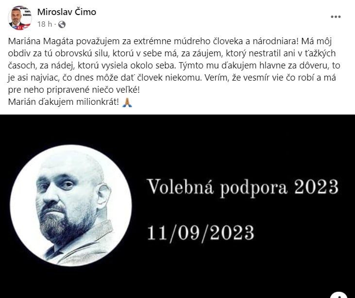 „Mariána Magáta považujem za extrémne múdreho človeka a národniara! Má môj obdiv za tú obrovskú silu, ktorú v sebe má, za záujem, ktorý nestratil ani v ťažkých časoch, za nádej, ktorú vysiela okolo seba. Týmto mu ďakujem hlavne za dôveru, to je asi najviac, čo dnes môže dať človek niekomu. Verím, že vesmír vie, čo robí, a má pre neho pripravené niečo veľké! Marián ďakujem milionkrát!“ napísal Čimo na Facebooku len včera.