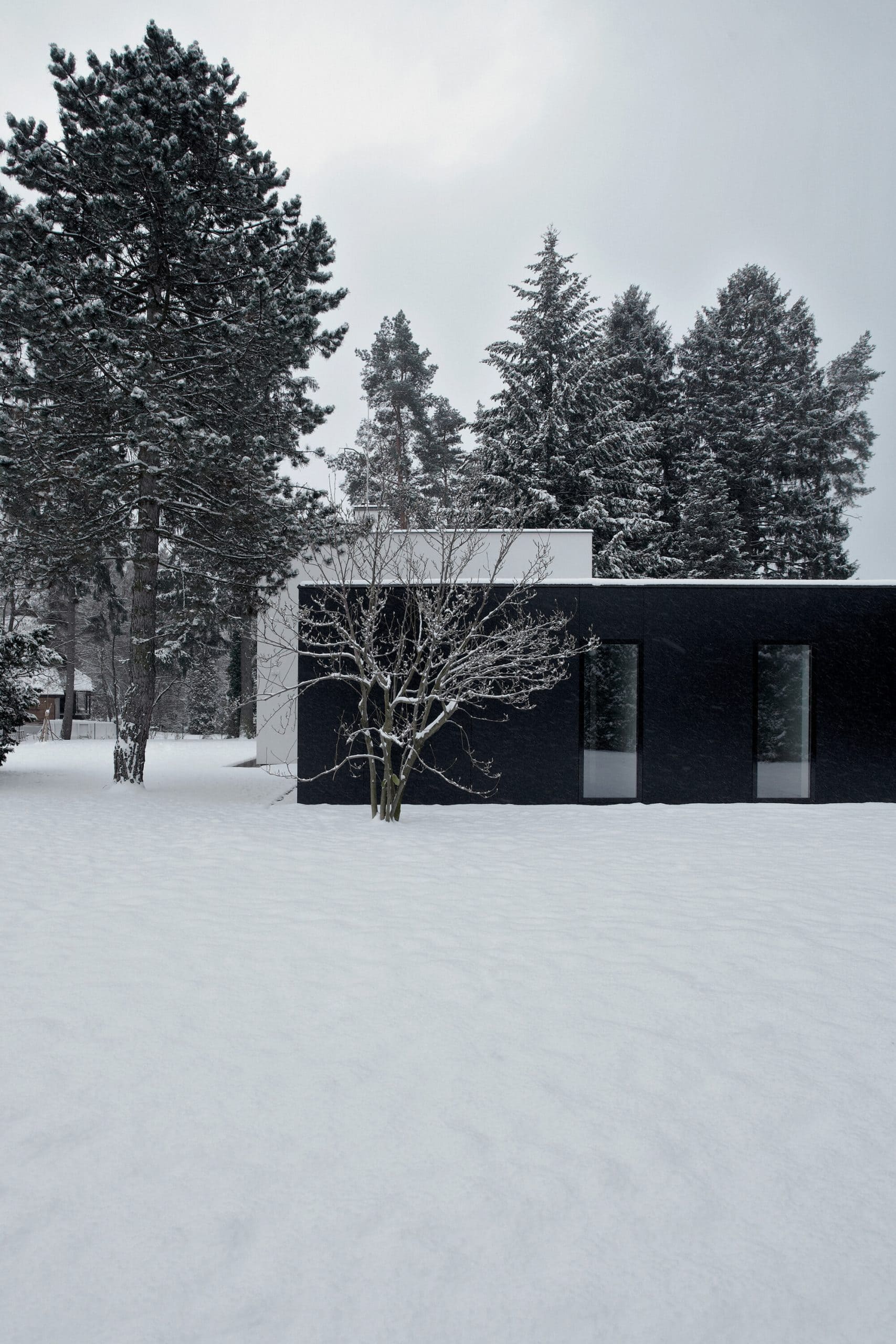 Časť prístavby slúži ako zastrešené státie pre osobné automobily. Nová časť je od existujúceho domu materiálovo a výrazovo v kontraste. Čierne obkladové fundermax dosky prístavby sú v kontraste s bielou omietkou funkcionalistické vily.