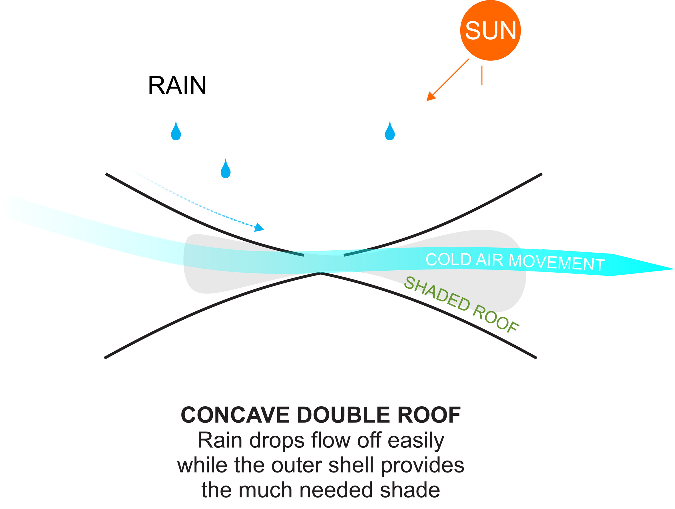 Dvojitý strešný systém tvorí klenutá strecha pod spádovou oblasťou v tvare misy, navrhnutá tak, aby zachytila aj tie najmenšie kvapôčky vody. Tie následne stekajú dolu a zhlukujú sa do väčších kvapiek, ktoré sa nahromaždia v nádobe ešte pred ich vyparením. Vďaka tieňu a pohybu vetra medzi dvoma strechami je zároveň podporované aj prirodzené chladenie.