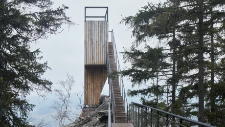 Prudké schodisko ťa dovedie na platformu s krásnym výhľadom. Keď sa započúvaš, možno budeš počuť aj šum rieky, ktorá preteká divokým údolím z hôr na hraniciach s Poľskom. Oplatí sa tu sadnúť na schody a sledovať panorámu kopcov nad riekou.