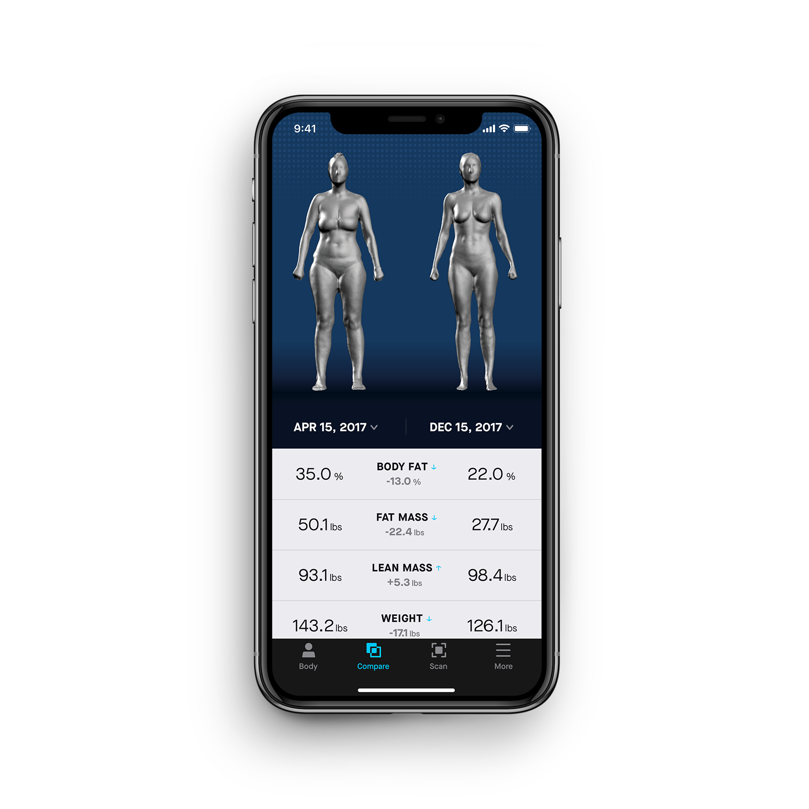 Aplikácia zároveň ponúka možnosť porovnávania si jednotlivých skenov, a tak si užívateľ môže porovnať výsledne údaje a hodnoty, sledovať svoju kondíciu a v prípade potreby navrhnúť lepší a efektívnejší fitness plán.