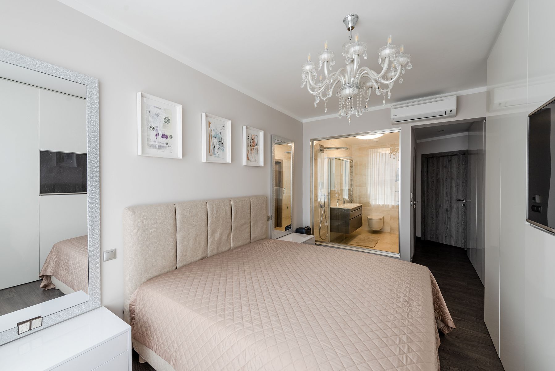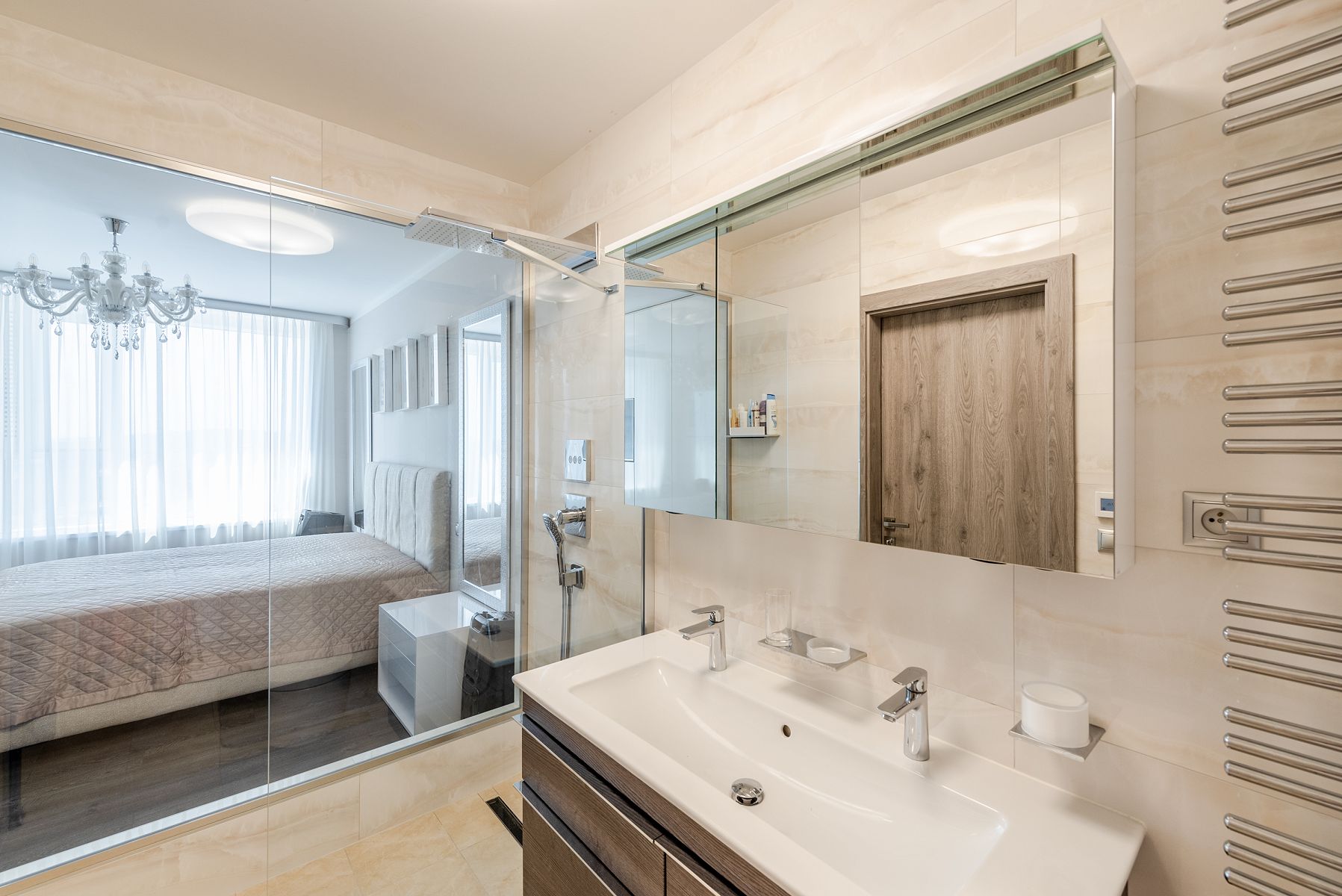 Kuchyňa je kompletne vybavená so spotrebičmi nemeckej značky Gaggenau. Tvojej pozornosti neunikne ani kuchynská pracovná doska z mramoru, ktorá miestnosti dodáva luxusný nádych. V hlavnej spálni nájdeš vstavaný šatník a kúpeľňu s veľkým walk-in sprchovým kútom značky Hansgrohe. Miestnosti sú od seba oddelené presklenou priečkou.
