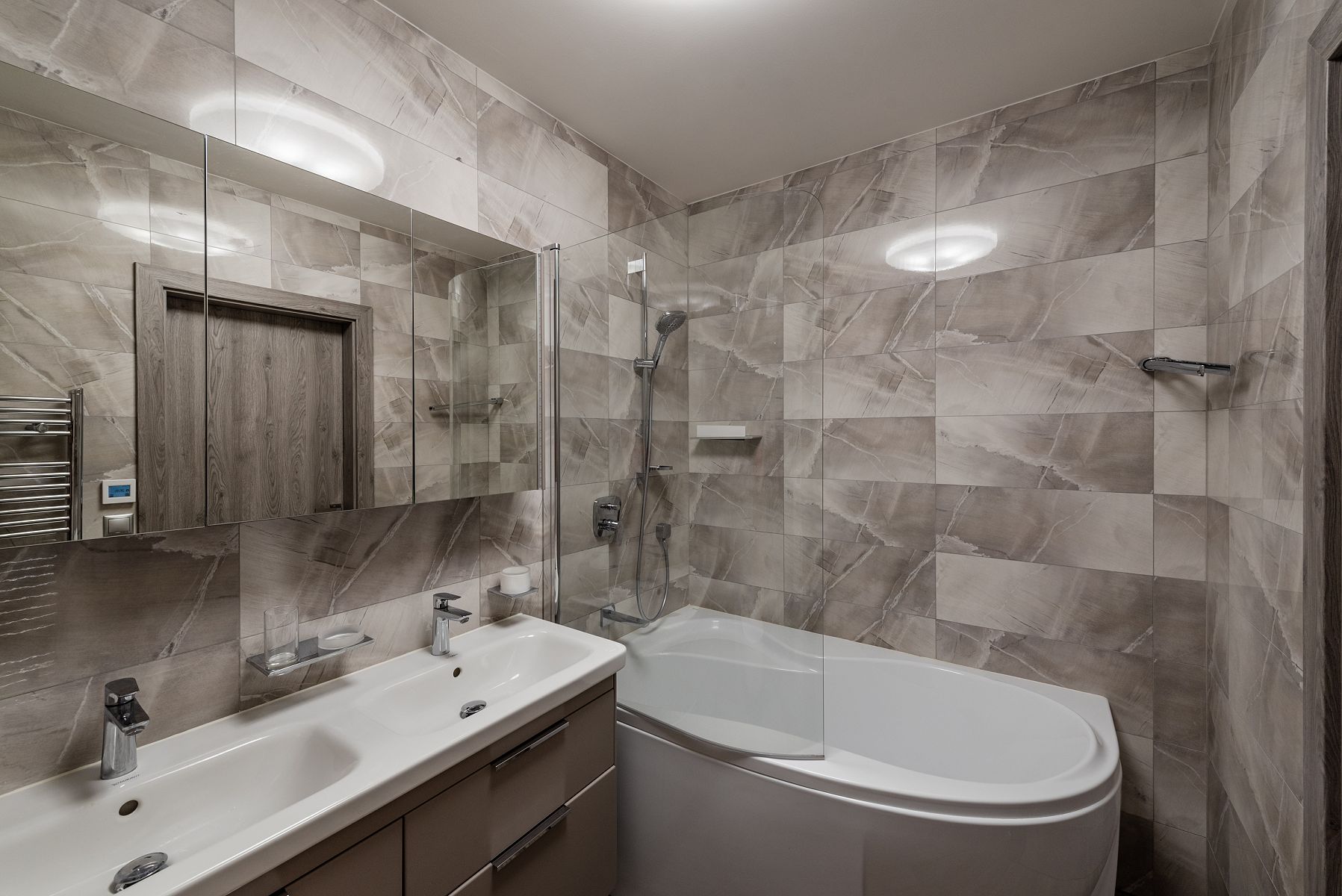 Druhá spálňa vznikla spojením dvoch menších izieb a jej súčasťou je taktiež vstavaný šatník a kúpeľňa s vaňou a toaletou. V byte nechýba ani práčovňa s technickou miestnosťou, no tie dokázali architekti šikovne schovať.
